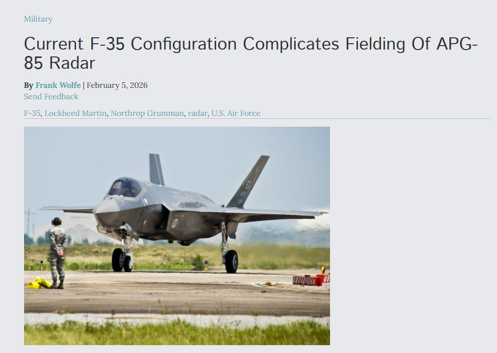 据美国“Aviation Today”(今日航空)的最新报道称,由于美国新一代的数字阵列氮化镓AN/APG-85雷达交付日期严重推迟,导致自2025年6月份以来交付的美军自用版F-35战机全都没有安装雷达,机头无奈只能挂配重。与此同时,还有多张F-35战机机头挂着“杠铃片”的图片流传了出来。
