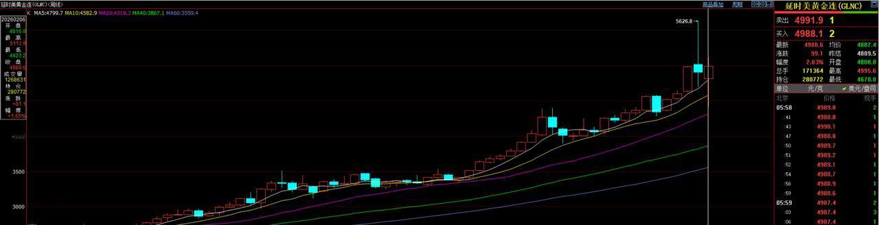 刚刚过去的一周, 是二月份的第一个交易周。 国际黄金连续合约, 当周开盘价为4816美元/盎司, 盘中最高价5113.9美元/盎司, 最低价4423.4美元/盎司, 收盘价4988.6美元/盎司, 上涨81.1美元,涨幅1.65%。 对于未来一周, 期货小褚依旧比较看好, 5100美元在向我们招手!!!