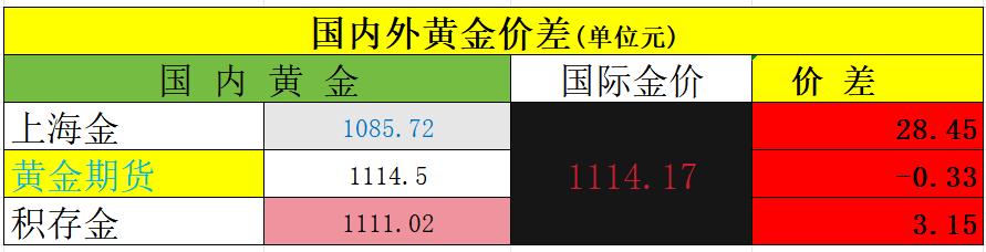 今天是周日, 本周上海金收盘于1085.72元, 民生积存金停收于1111.02元, 国内黄金期货停收于1114.5元。 国际金价收盘于4988.6美元, 简单折算成人民币就是1114.17元。 我们知道国内外黄金是有一定价差的。 通过下图,可以明显看出: 国内黄金期货最强; 国际金价次之; 上海金最弱,存在补涨。
