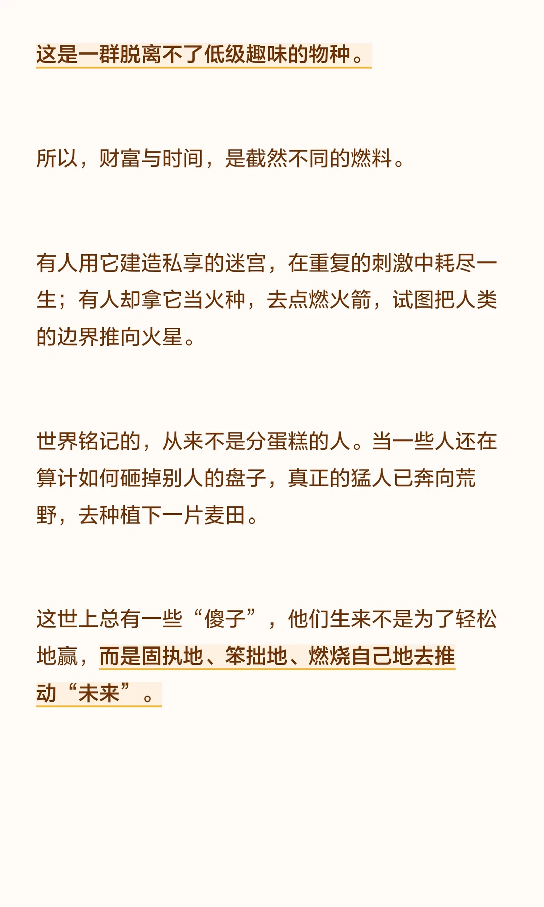马斯克每周工作90小时,创办SpaceX和特斯拉,多次濒临破产。 他选择押上一切,而非躺赢,将财富投入梦想,推动人类边界。真正的财富故事,是推动“未来”的燃烧。 他说,我本可以喝着酒、和裸模一起冲浪,但我选择每周工作90小时(每天12小时以上)。我把几乎所有精力都投入到创建SpaceX和特斯拉,并不是因为我认为它们是赚钱的捷径,它们都多次濒临破产。在创办之初,我认为它们成功概率不到10%,也做好了赔光PayPal赚来全部资金的准备。