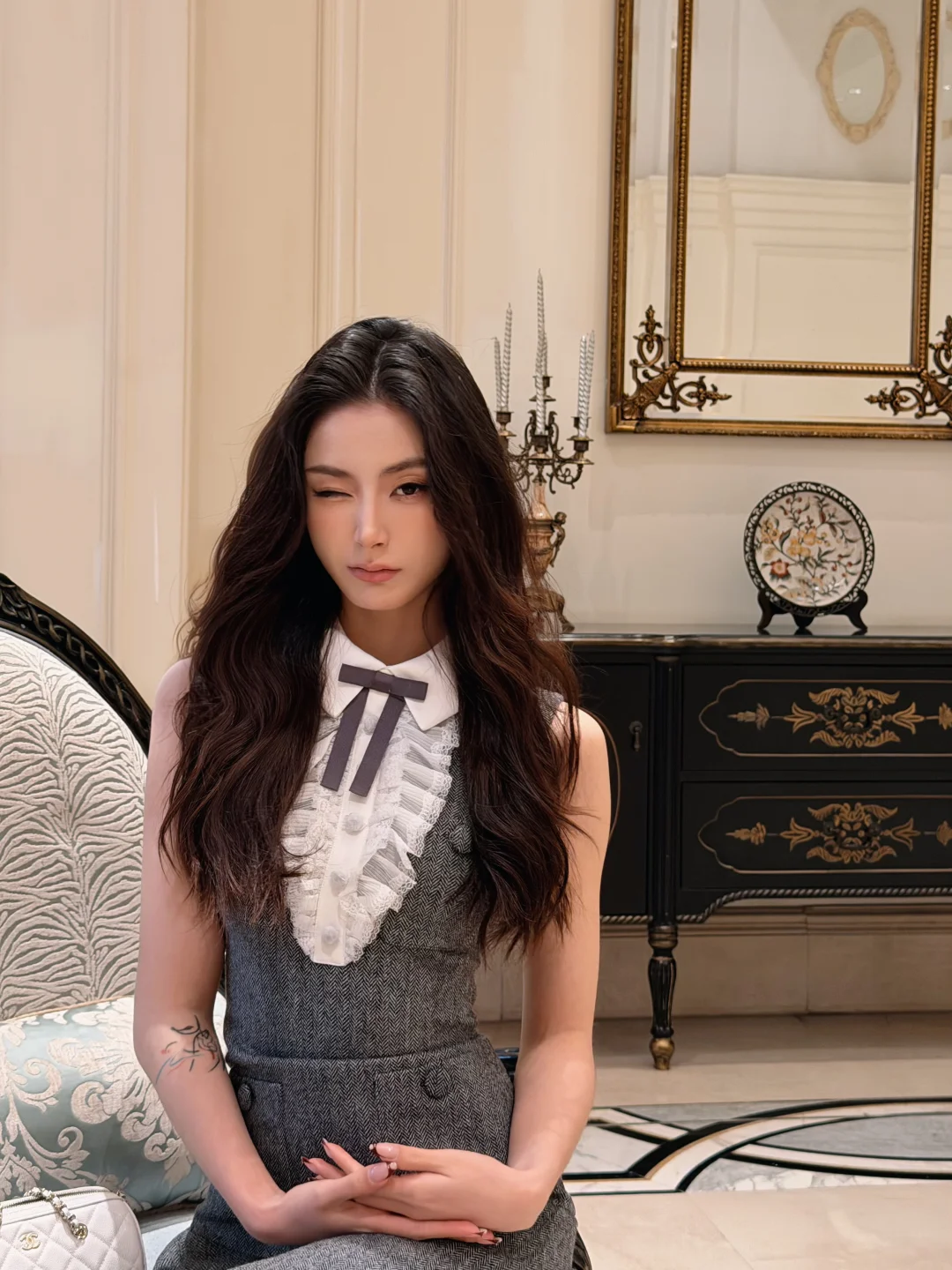 风拂柳,粉樱绽放,我身着浅粉蕾丝旗袍,立于古栏之下。长袖轻笼,盘髻缀珠,耳坠摇曳