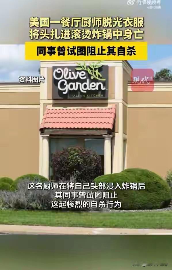 美国宾夕法尼亚州一家橄榄园餐厅发生的事太让人痛心了。厨师在营业时段突然脱光,把头扎进滚烫炸锅,同事和顾客紧急施救,女员工还被热油溅伤,但还是没能挽回他的生命。 餐饮业是高压行业,后厨高温高油烟,出餐节奏快,还得应对顾客各种要求。数据显示,70%的厨师曾因工作焦虑,44%的人工作影响心理健康。这位厨师大概率是长期压力无处释放才选择极端方式。很多职场人默默硬扛,企业又重业绩效率,忽略员工心理。这悲剧真该给大家敲敲警钟了。