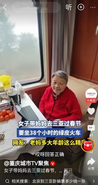 河南一个女儿,带妈妈去三亚过年,订了两张38个小时的绿皮火车票。 河南一个女儿,打算带妈妈去三亚过年,没买飞机票也没买高铁票,反而订了两张38个小时的绿皮火车票。 消息一出来,网上直接炸了,好多人都在指责她,有人说,38个小时啊,让老太太坐绿皮车,这哪里是带妈旅游,分明是折磨妈。 还有人说,快过年的时候,就算买不到机票,也不能这么折腾老人,太不孝顺了。 其实大家不知道,这个女儿不是故意折腾妈妈,她有自己的难处。 她妈妈一辈子没出过远门,一直念叨着想看海、想看看南方的椰子树,女儿记在心里,就想着趁过年带妈妈圆了这个心愿。 而且她妈妈还有轻度关节炎,坐飞机会觉得不舒服,绿皮车虽然慢,但比较平稳,也能随时起身活动。 为了让妈妈在旅途中舒服点,女儿提前做了很多准备,带了颈枕、毛毯和热水袋,还下载了妈妈爱看的老电影,每隔一小时就给妈妈按摩腿部,缓解关节不适。 晚上车厢里很安静,母女俩依偎在一起,聊起小时候的事,妈妈说起当年背着发烧的她走十里山路看病的经历,女儿也说起小时候妈妈对她的照顾,聊着聊着,就忘了旅途的疲惫。 火车经过琼州海峡的时候,整列火车会被送上渡轮,妈妈盯着窗外的大海看了整整一个小时,眼神里全是新奇,像个孩子一样开心。 后来网友们知道了这些情况,指责声慢慢变成了称赞声,大家都说,原来这不是折腾,是最实在的孝心。 铁路部门后来也回应,说会关注长途普速列车上老年旅客的出行问题,试点加装可调节座椅、增设老年专座,让老年旅客出行更安心。 说到底,这个女儿的初心很简单,就是想多陪陪妈妈,带妈妈看看外面的世界。 她选择的虽然是慢火车,但这段38小时的旅程,装满了母女俩的温情,比任何贵重的礼物都更动人。 以上都是个人观点,对此您有什么不同的看法,可以在评论区留言讨论!!!