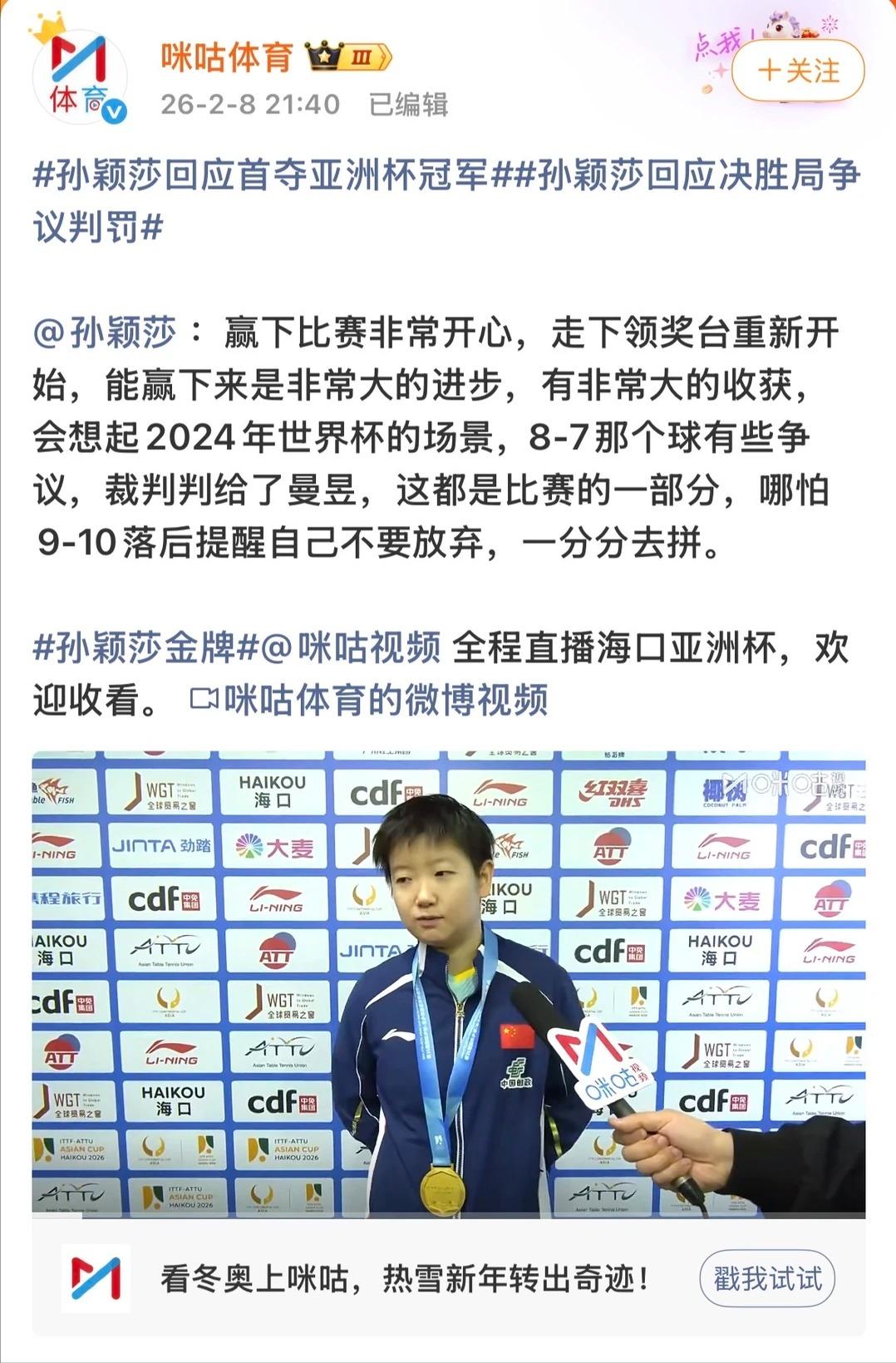 好朋友好搭档又一次小小的巅峰相见啦![撒花][撒花][撒花] 恭喜莎莎和楚钦获得海口亚洲杯女单和男单冠军!新年的第一冠也是职业生涯的第一个亚洲杯冠军,值得祝贺呀! 莎莎和曼昱的女单决赛一如既往的焦灼又精彩,两人的比赛,有技战术的比拼,也不乏争议球,24年世界杯有擦边争议,多哈世乒赛也有擦边球争议,今天决胜局又一个8-7的擦边争议球。 就像莎莎赛后采访说的,争议球也是比赛的一部分,哪怕9-10落后也提醒自己不要放弃,一分分去拼,最后关键分上,还是莎莎大心脏,胜利的天秤在莎莎这边,夺冠也是实至名归了! 男单这边,王楚钦和张本智和的比赛也是跌宕起伏,险象环生,张本智和这次明显准备充分,可惜短暂休整后的王楚钦也是不怵你的,最后4-2拿下,实现14-3的头对头战绩! 女单决赛:鸡飞狗跳。男单决赛:本子玩命。结果还是中国队笑到了最后![惊喜] 恭喜中国女队又一次包揽冠亚军,男单卫冕冠军!明年再接再厉![鼓掌][中国赞]