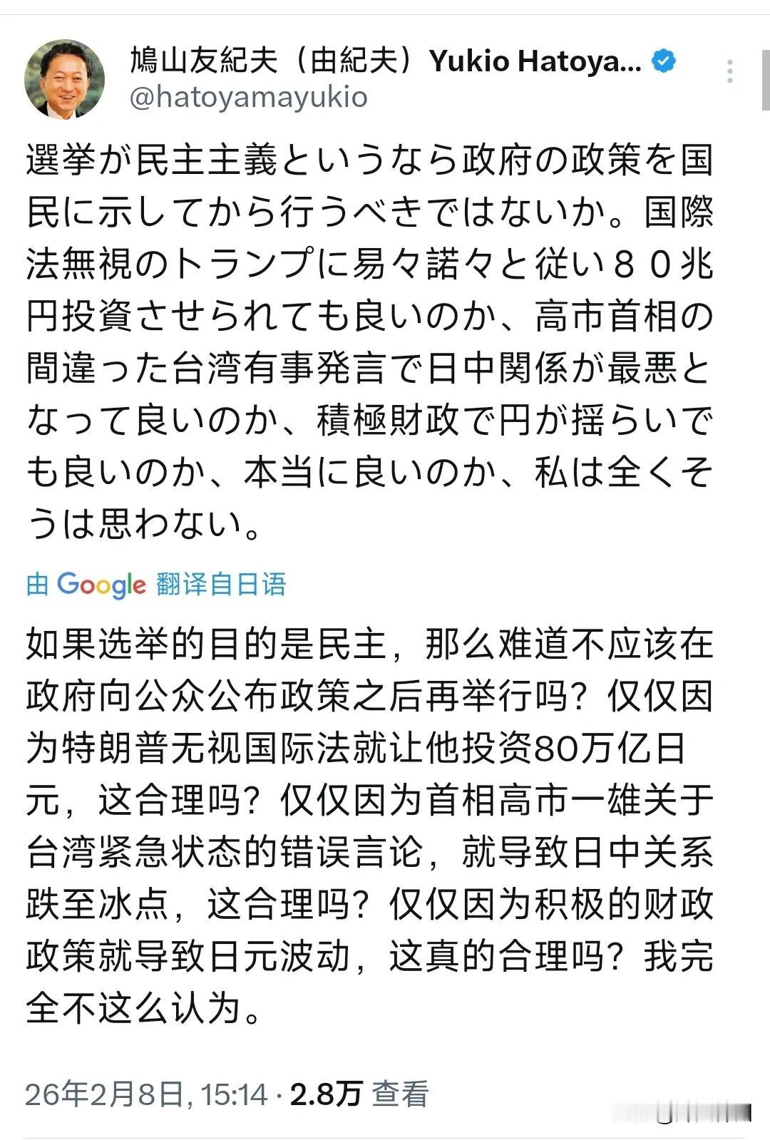 日本前首相鸠山由纪夫今天(2月8日)写道:“如果选举真的是民主的体现,难道不应该在向国民明确政府政策之后再进行吗?我们真的可以默许政府在无视国际法的特朗普面前唯命是从,白白投入80万亿日元吗?真的能接受高市首相在台湾问题上的错误言论,让日中关系恶化到谷底吗?真的可以任由积极财政政策导致日元汇率动荡不安吗?真的可以吗?我绝不这么认为。” 评几句: 日本前首相鸠山由纪夫公开发声,连续五问直指日本政坛核心问题。他痛批政府对外过度妥协,耗费巨额国民财富却让国家陷入被动,更直言涉台错误言论严重破坏中日关系大局,同时指出相关财政政策引发日元动荡、民生压力持续加重。 在当下日本政坛,敢于说真话、坚持理性与底线的声音实在太少。鸠山由纪夫尊重国际法、坚守国家利益与民生福祉,敢于批评政策弊端、反对盲目追随、维护地区稳定,这份清醒与担当,在当下显得格外珍贵。 反观不少日本政客,为短期利益炒作议题、牺牲外交大局、无视民众生活压力,将国家推向风险边缘。鸠山由纪夫的发声,是日本政坛稀缺的良知与理性,虽势单力薄,却道出了民众心声,更戳破了日本当前的现实困境。对此,你怎么看?