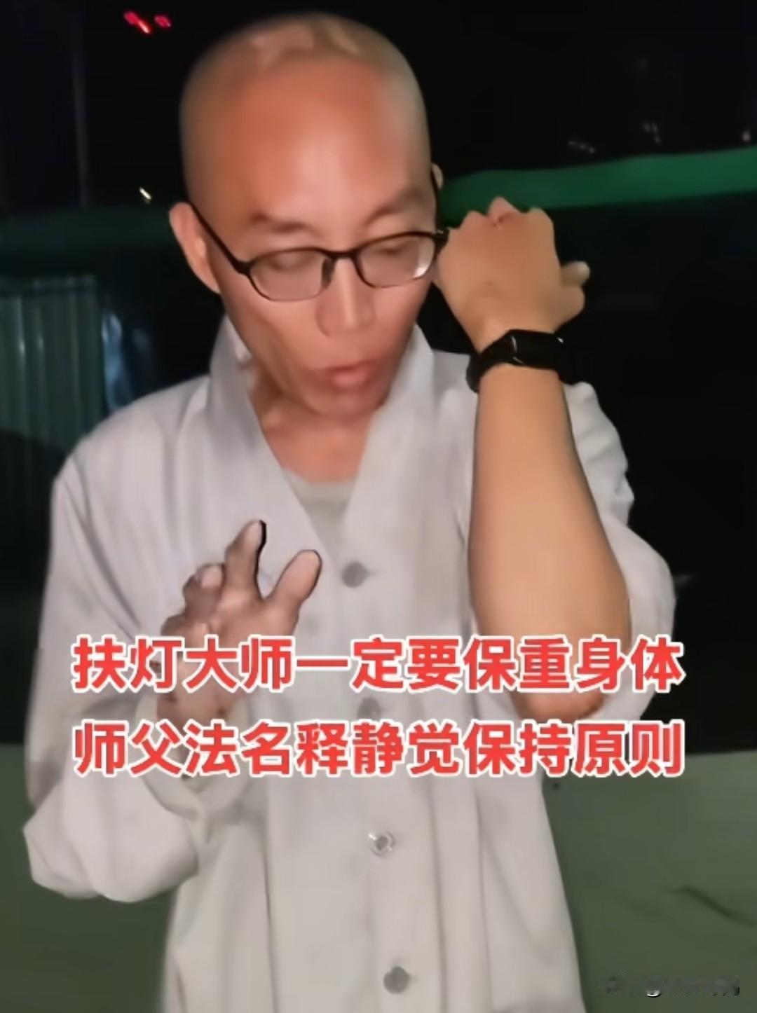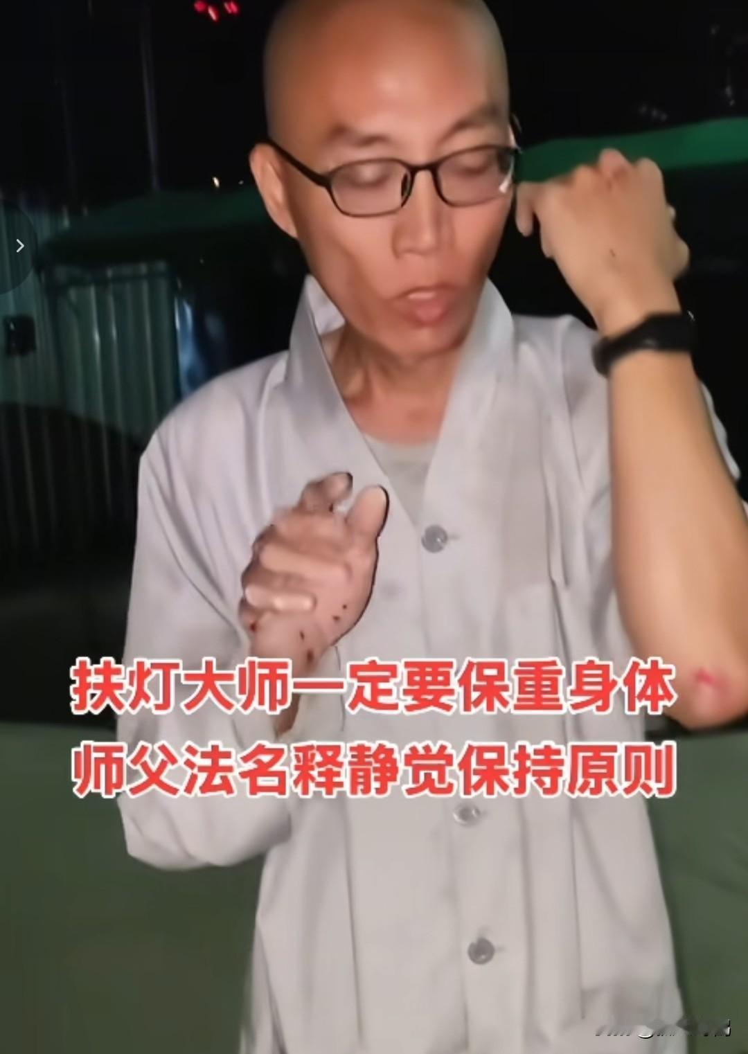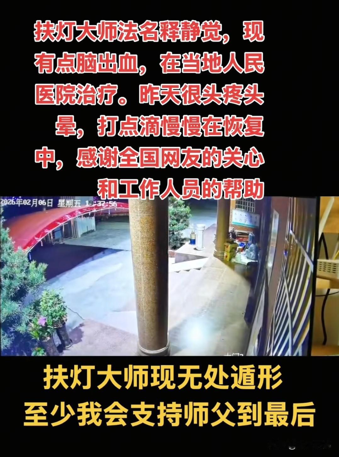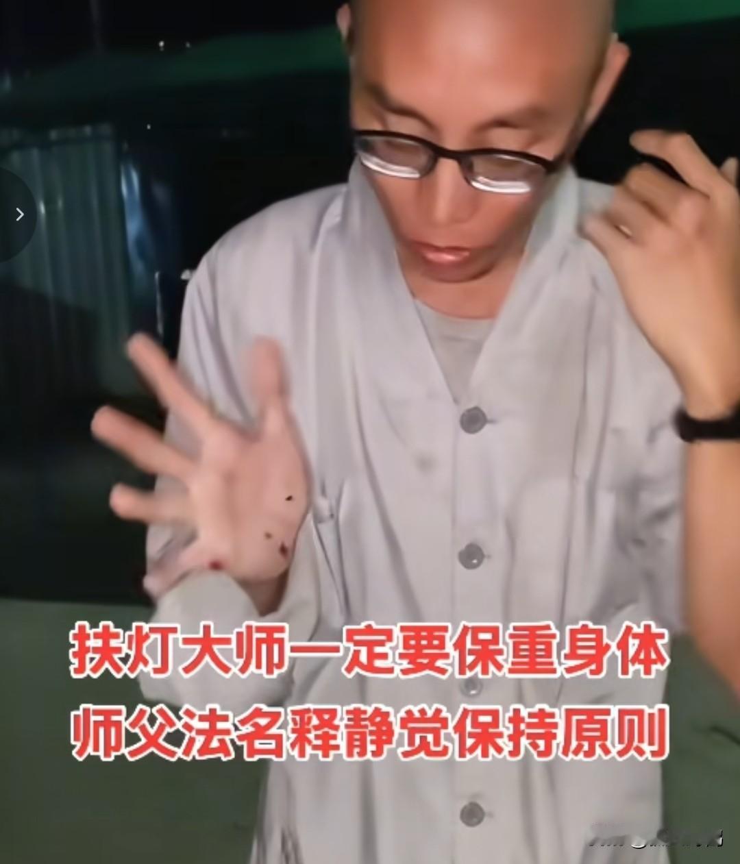 扶灯大师跳江后续: 人被救回无大碍,真容曝光,其朋友透更多 2月4日晚上,扶灯大师(释静觉)站在吴川江心岛大桥上扶着路灯,想要跳江,在民警的劝导下情绪慢慢稳定了下来,随后被民警趁机抓住手救了下来。 所以大师并没有跳下去,而是被民警及时救了下来,因为事发突然,大师重重摔在地上,导致其脸部手臂以及膝盖被磕点皮,送医检查后,身体并无大碍。 请看配图,据大师的朋友说,大师目前还在住院,因为头疼头晕脑出血,在打吊水慢慢恢复中,至于网上传大师被寺庙驱赶的原因并没有透太多。 但寺庙的通报在1月31日就发布了,其内容是因为大师多次“谩骂师傅、扰乱秩序与僧团搞对抗、拉帮结派”行径,才被回归诗主持以及管理组织决定其迁单。 而大师带着几位弟子无处可出,也就是为什么大师想不开的原因。 至于大师出院后该去何处,无人知晓,因为涉事寺庙是坚决不让其居住的。 希望官方能彻底事件原委处理结果,也希望“扶灯大师”出院后能得到妥善安置。愿每个大师都能被温柔以待。 对于此事,你怎么看?