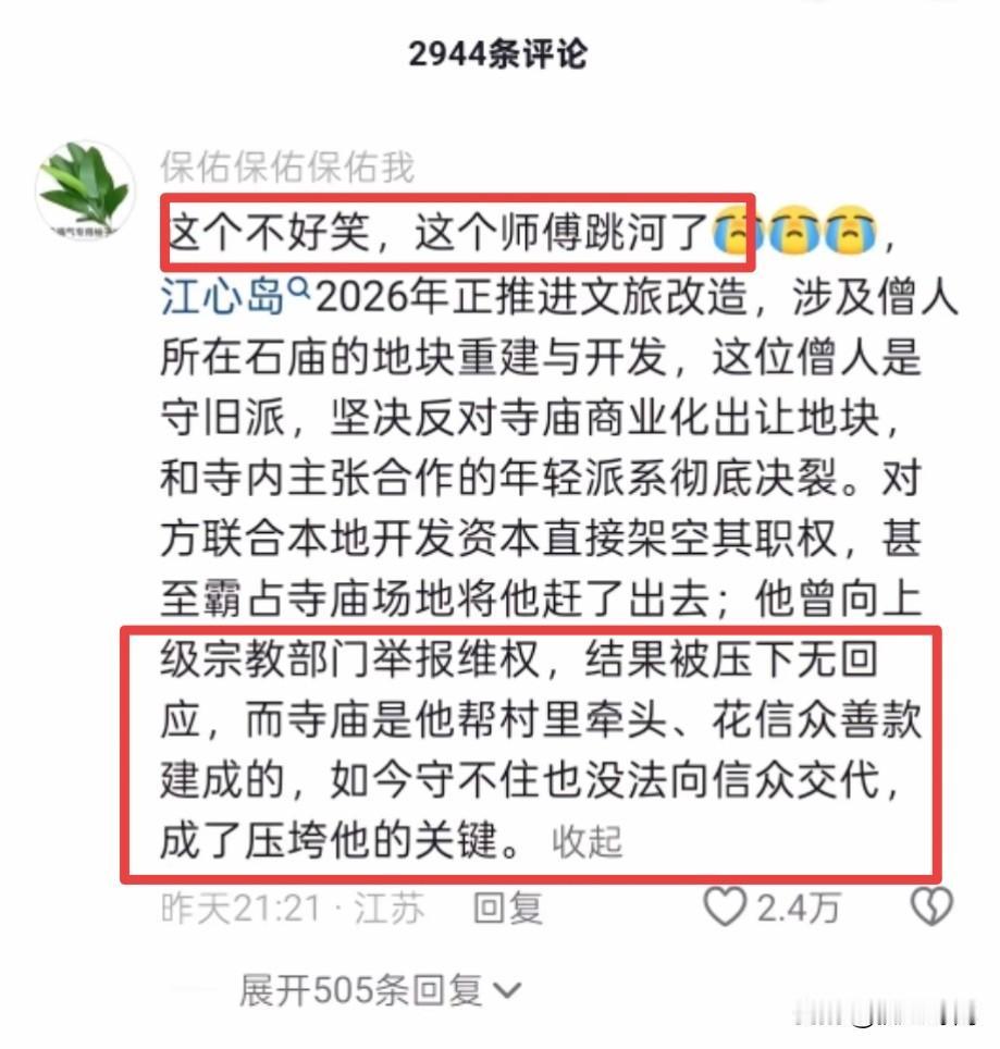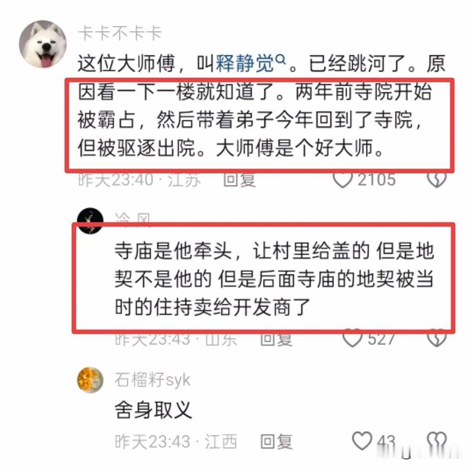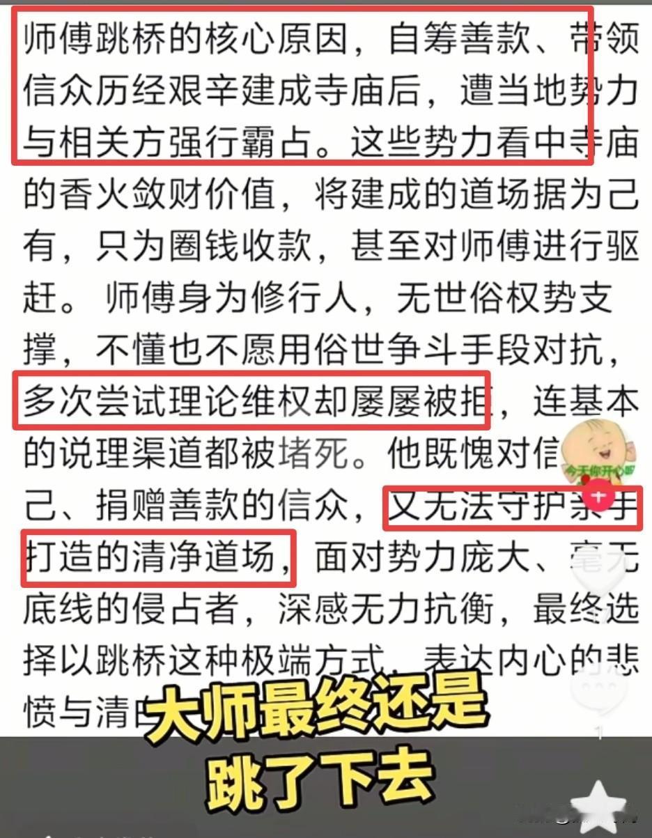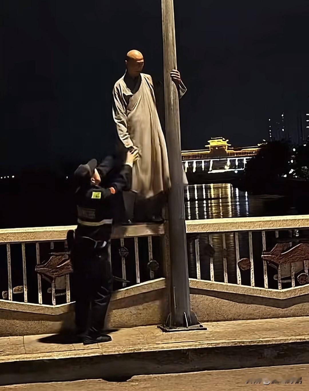 扶灯大师跳江后续: 人被救回无大碍,真容曝光,其朋友透更多 2月4日晚上,扶灯大师(释静觉)站在吴川江心岛大桥上扶着路灯,想要跳江,在民警的劝导下情绪慢慢稳定了下来,随后被民警趁机抓住手救了下来。 所以大师并没有跳下去,而是被民警及时救了下来,因为事发突然,大师重重摔在地上,导致其脸部手臂以及膝盖被磕点皮,送医检查后,身体并无大碍。 请看配图,据大师的朋友说,大师目前还在住院,因为头疼头晕脑出血,在打吊水慢慢恢复中,至于网上传大师被寺庙驱赶的原因并没有透太多。 但寺庙的通报在1月31日就发布了,其内容是因为大师多次“谩骂师傅、扰乱秩序与僧团搞对抗、拉帮结派”行径,才被回归诗主持以及管理组织决定其迁单。 而大师带着几位弟子无处可出,也就是为什么大师想不开的原因。 至于大师出院后该去何处,无人知晓,因为涉事寺庙是坚决不让其居住的。 希望官方能彻底事件原委处理结果,也希望“扶灯大师”出院后能得到妥善安置。愿每个大师都能被温柔以待。 对于此事,你怎么看?