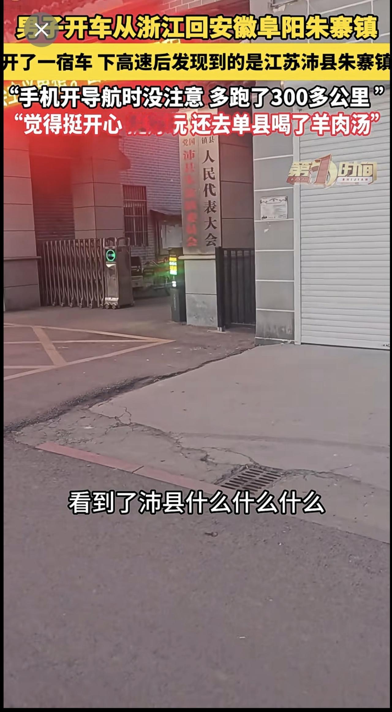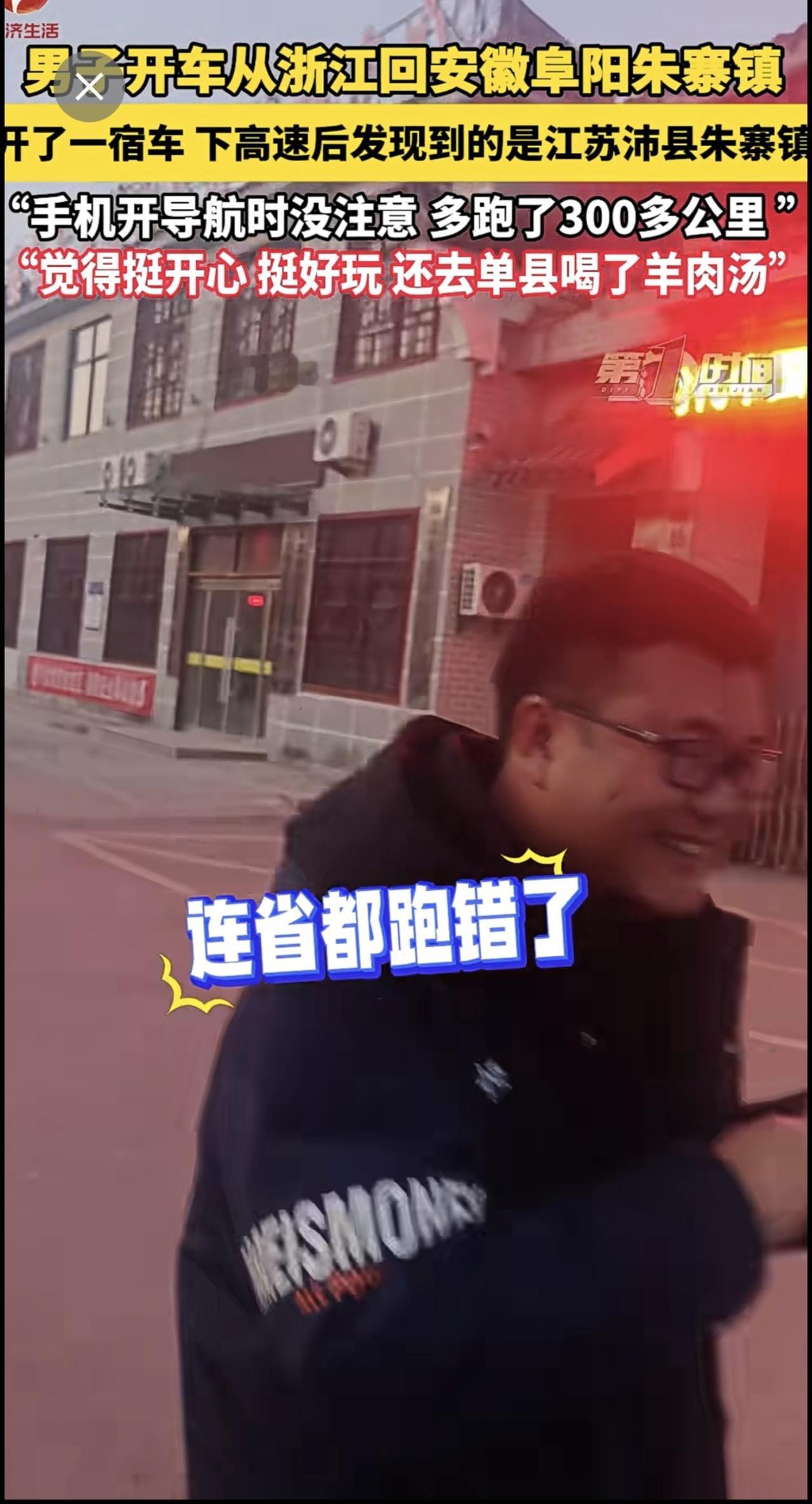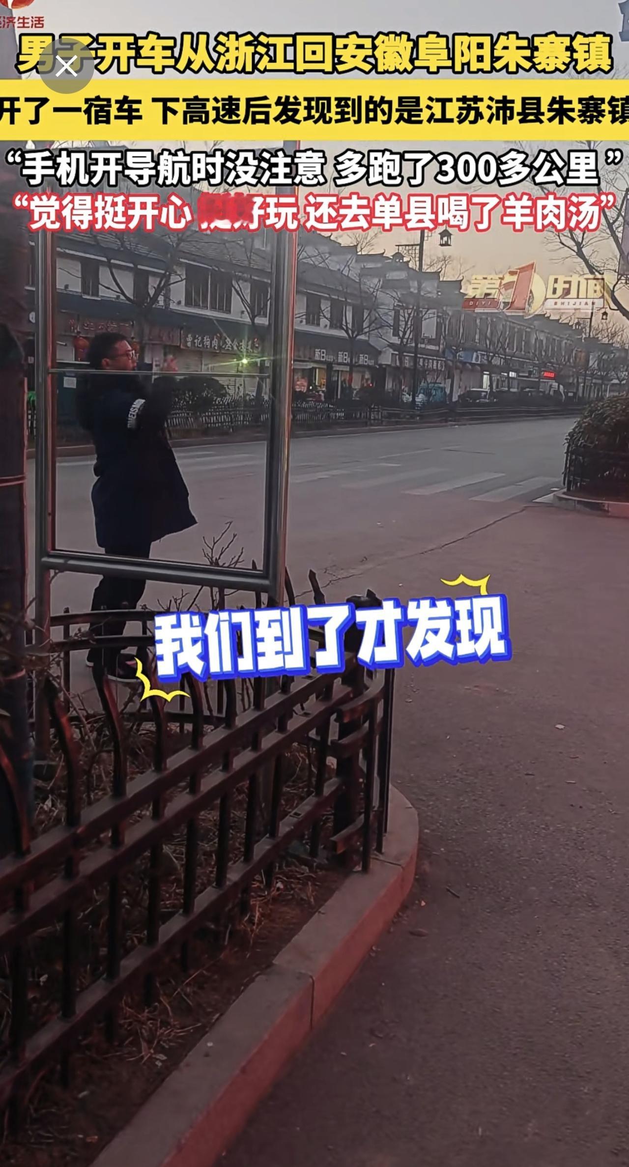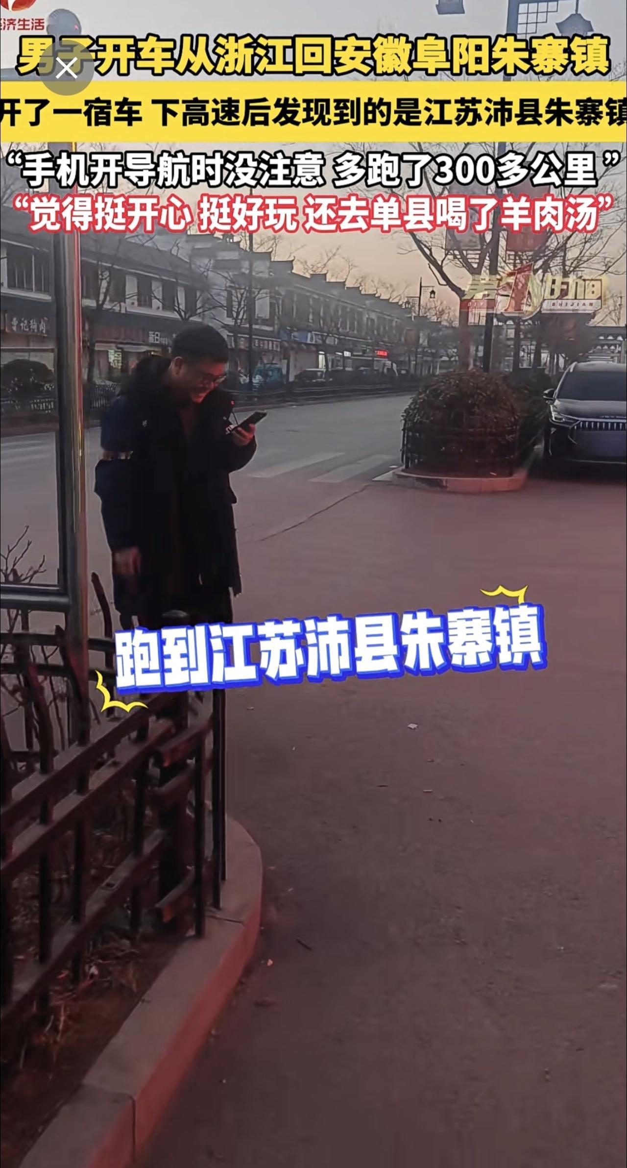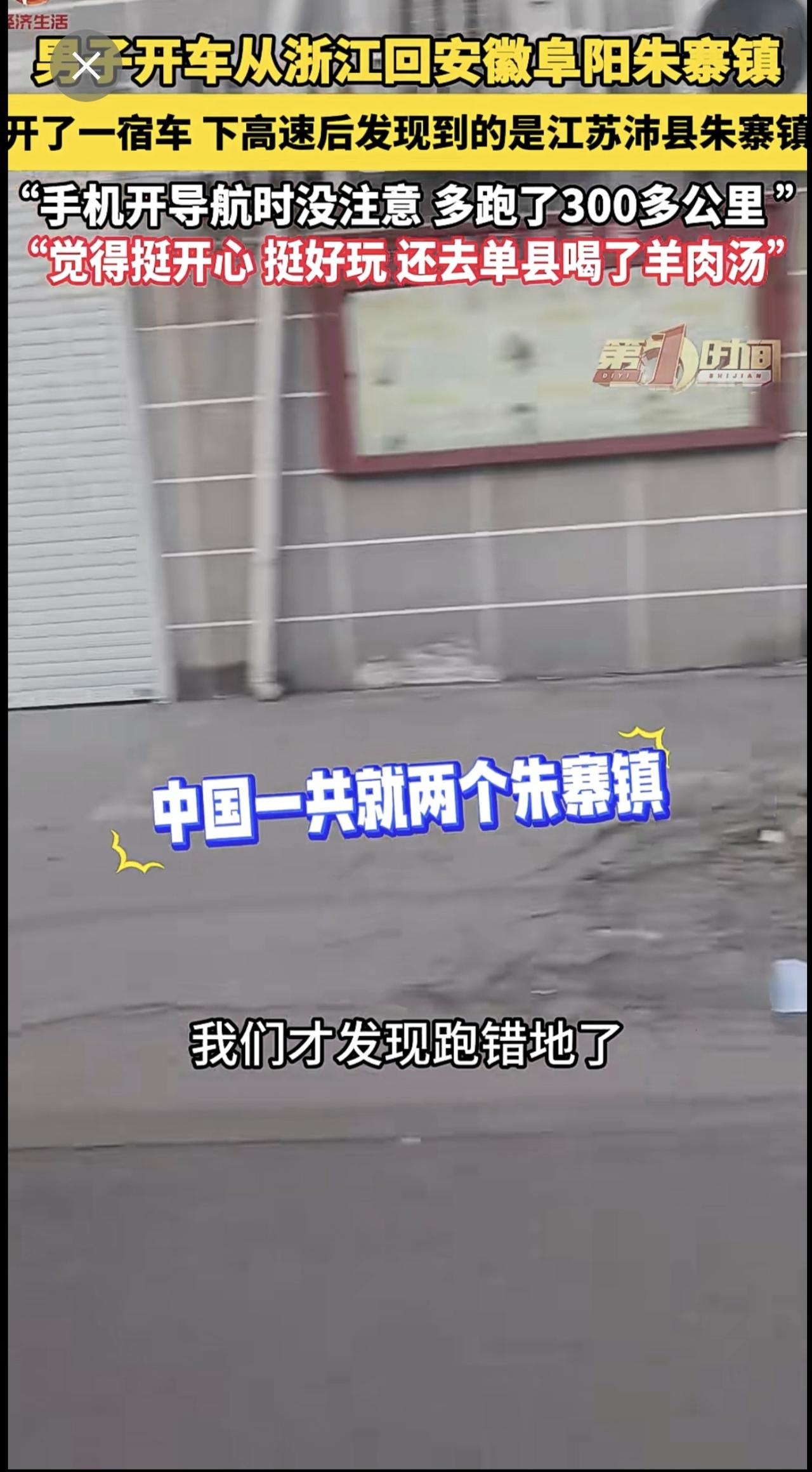 男子开车从浙江回安徽阜阳朱寨镇,开了一宿车,下高速后发现到的是江苏沛县朱寨镇。多跑了300多公里,觉得挺好玩,挺开心。最美中国