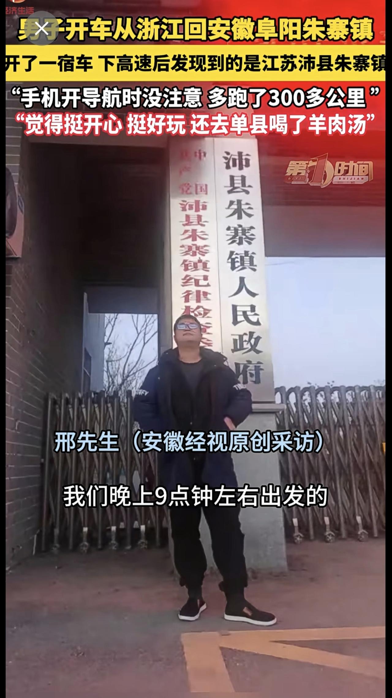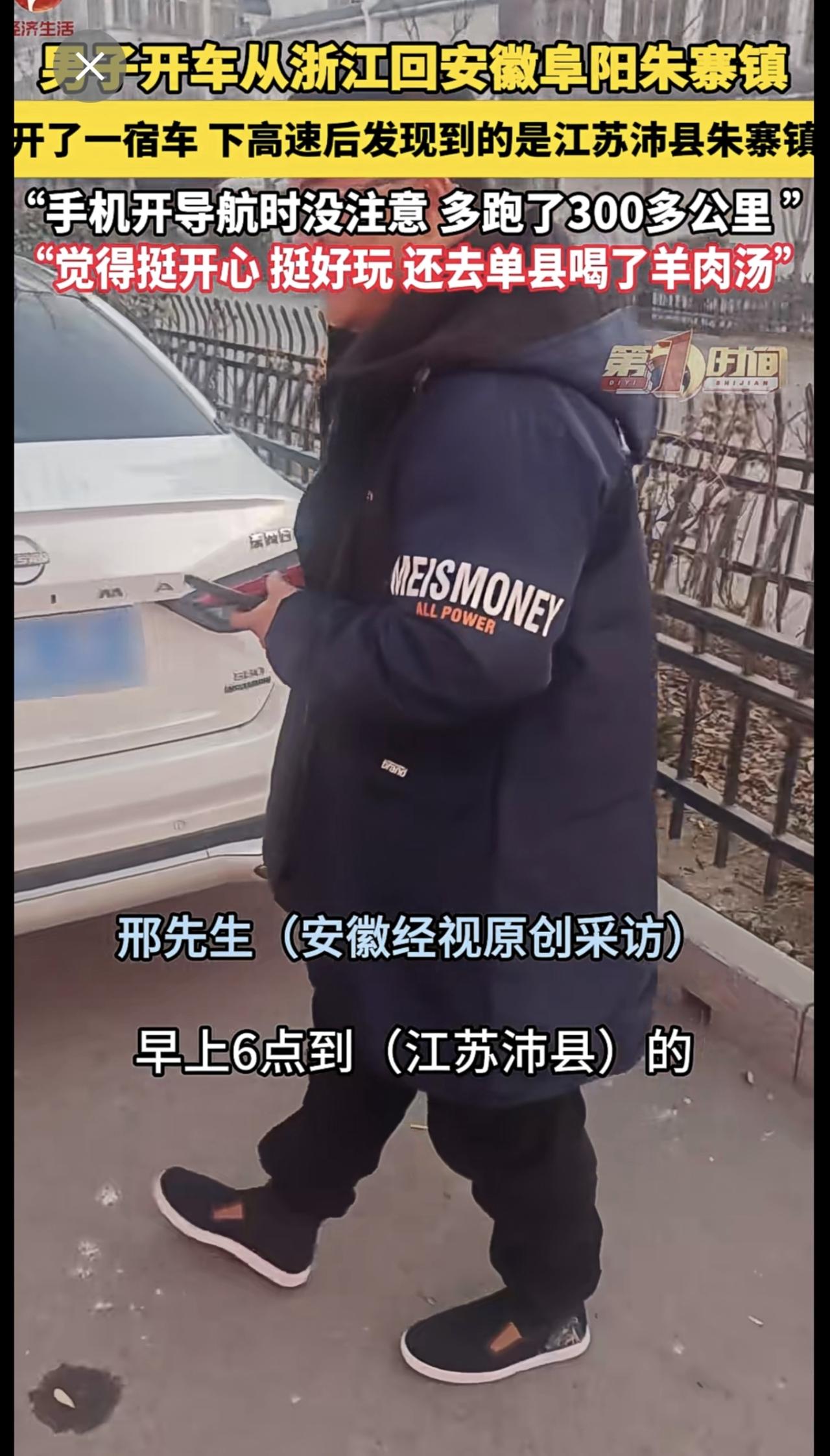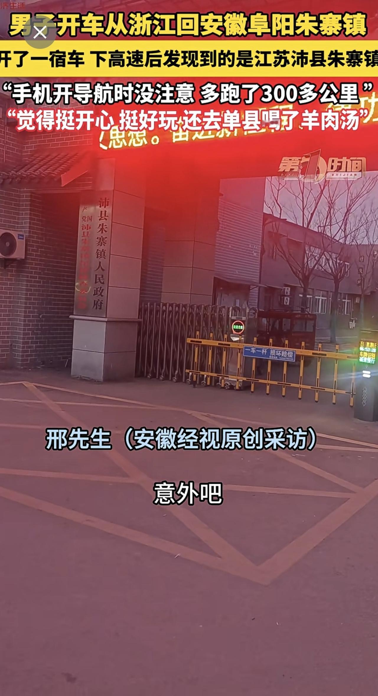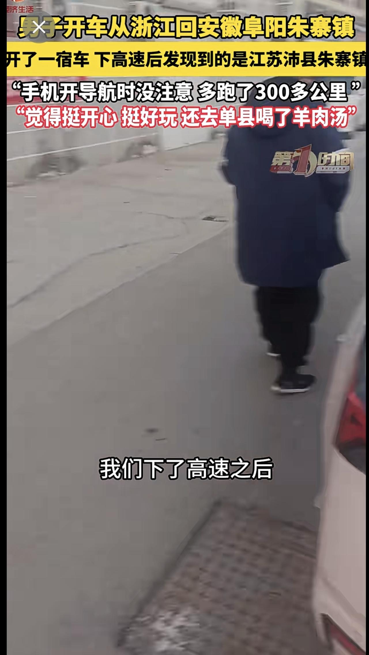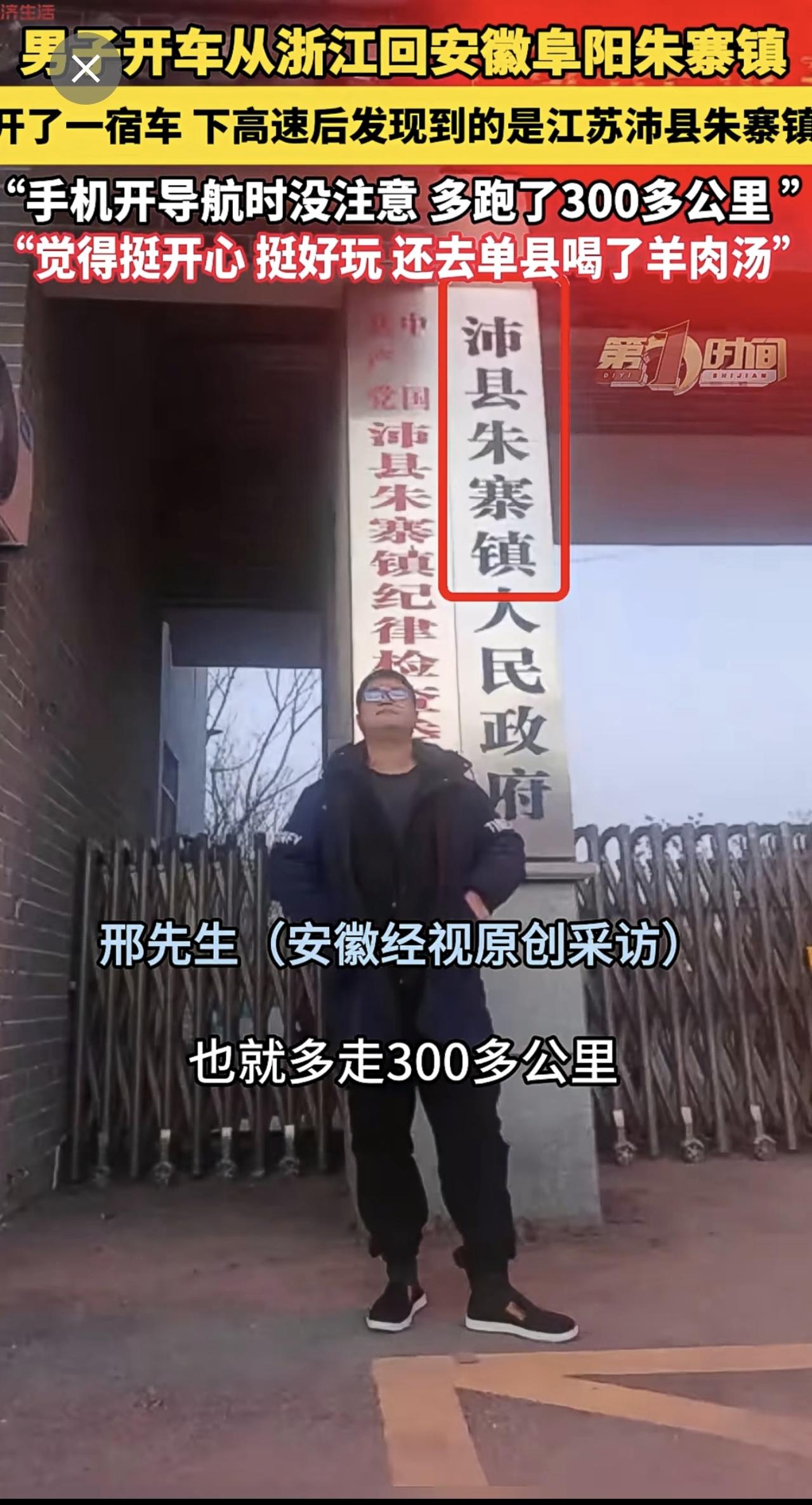男子开车从浙江回安徽阜阳朱寨镇,开了一宿车,下高速后发现到的是江苏沛县朱寨镇。多跑了300多公里,觉得挺好玩,挺开心。最美中国