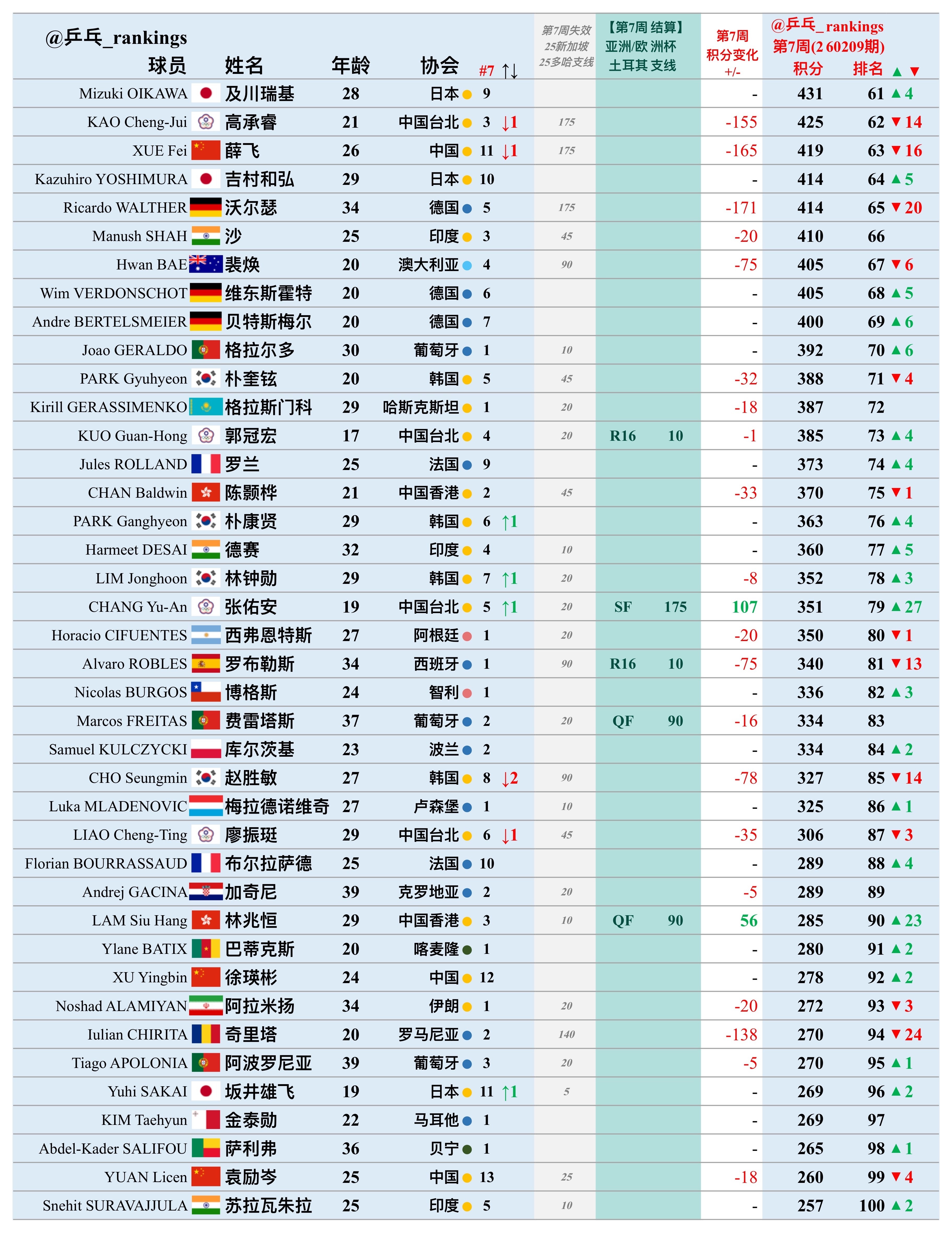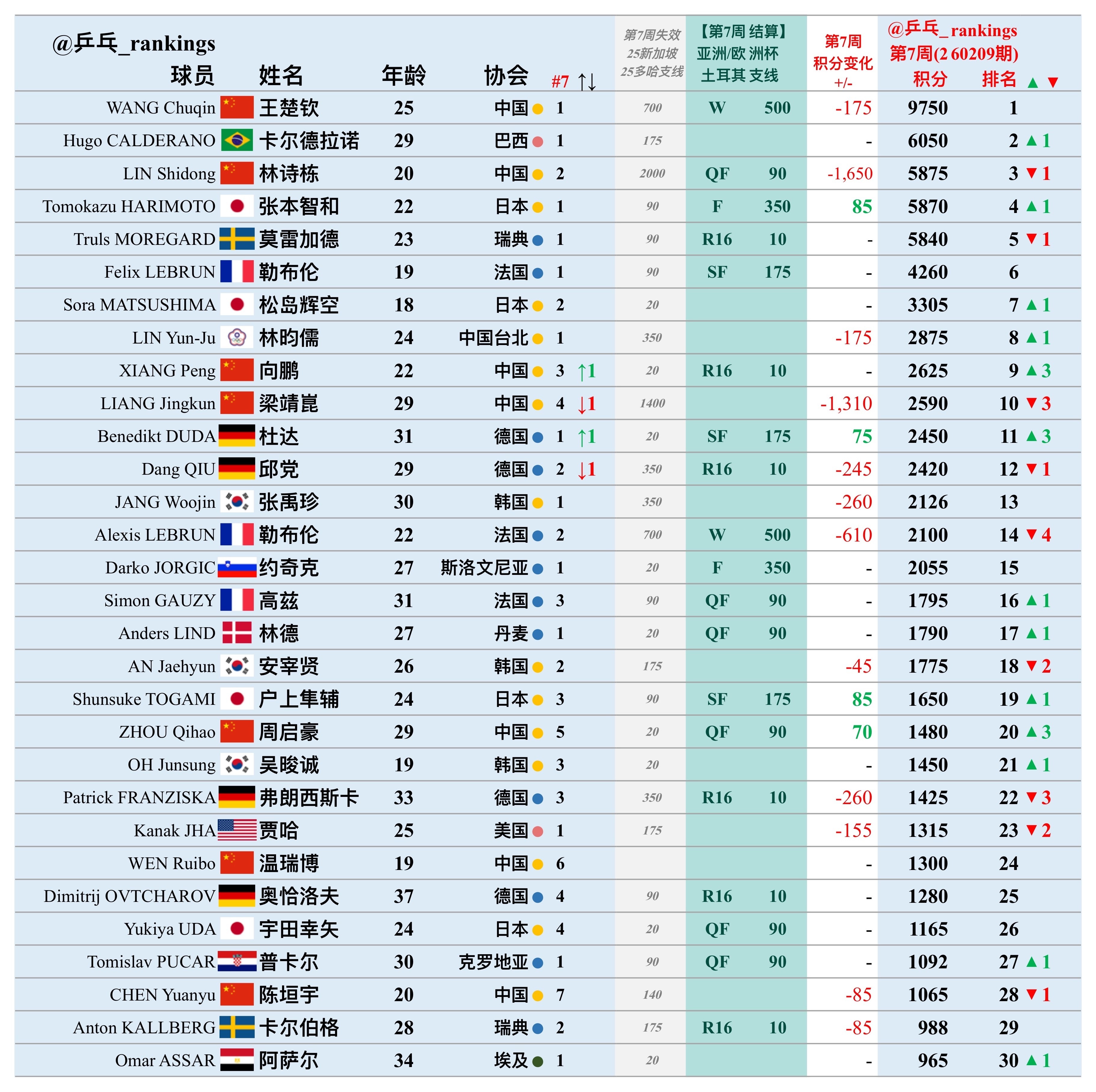 第7周世排积分变化(20260209期)【男单】🔺本周结算• 亚洲杯• 欧洲十六强杯• WTT支线赛土耳其站🔻本周失效• WTT新加坡大满贯2025• WTT新加坡青少年大满贯2025• WTT多哈支线2025