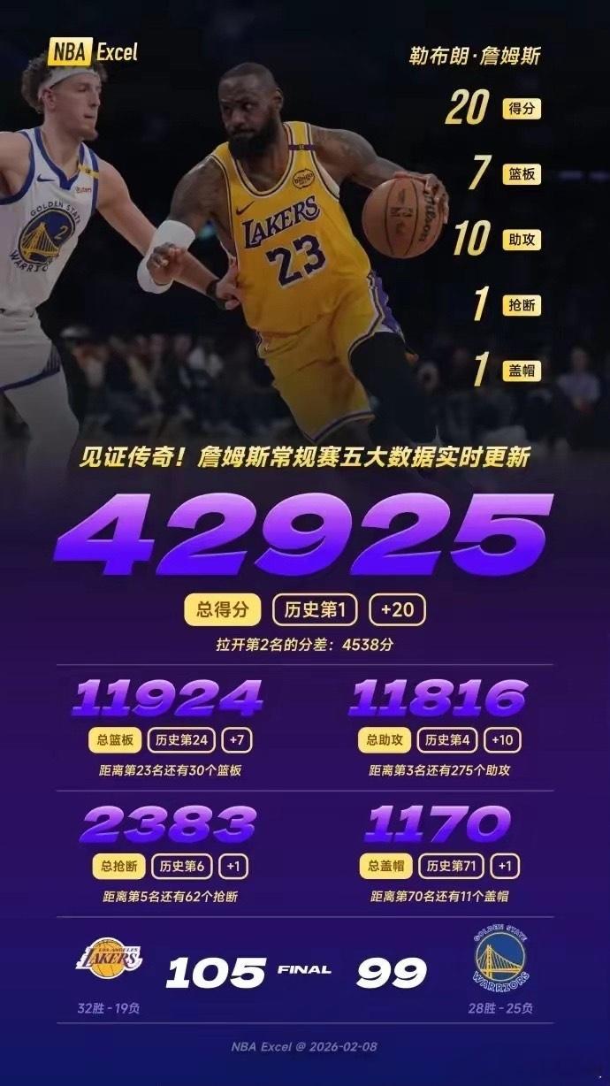 42925分!詹姆斯再次用实力证明了自己的传奇地位,35分钟的高效表现,湖人105-99力克勇士,他全场17投6中,砍下20分7篮板10助攻,这样的全能数据,让人不得不感叹,这才是历史第一的真正含金量!年龄对他来说只是数字,41岁的他依然能在赛场上主宰比赛,用自律和热爱铸就了不朽的传奇,致敬老詹!nba詹姆斯