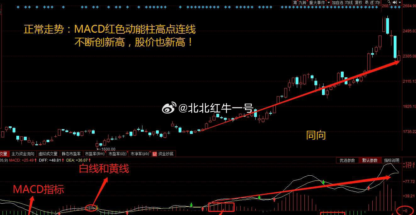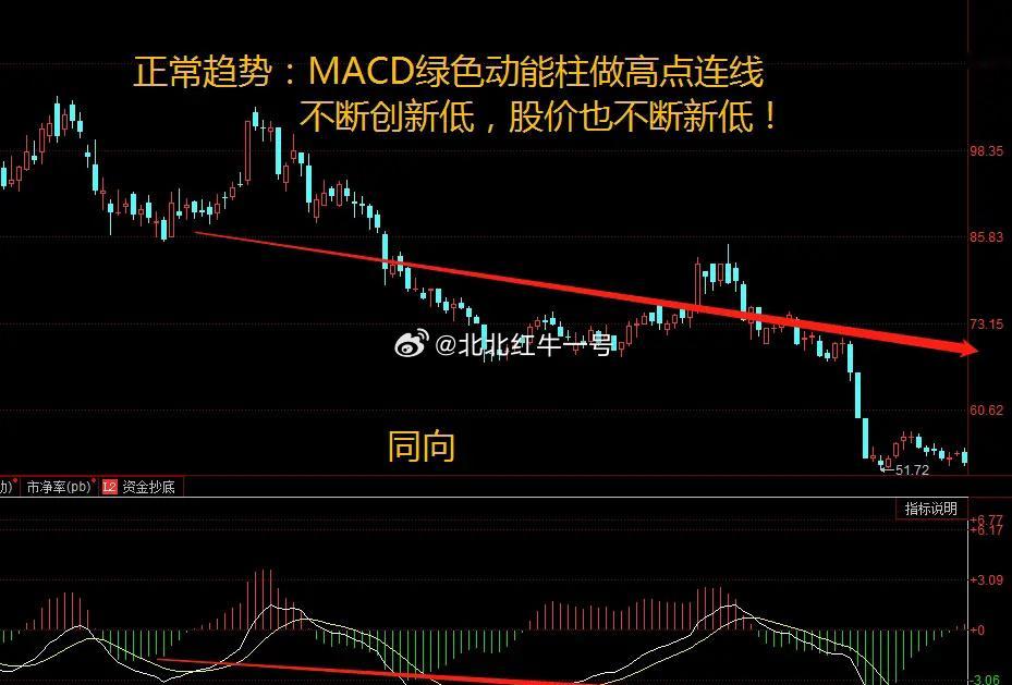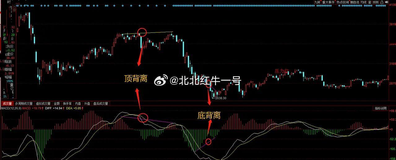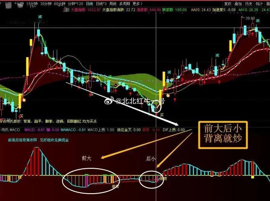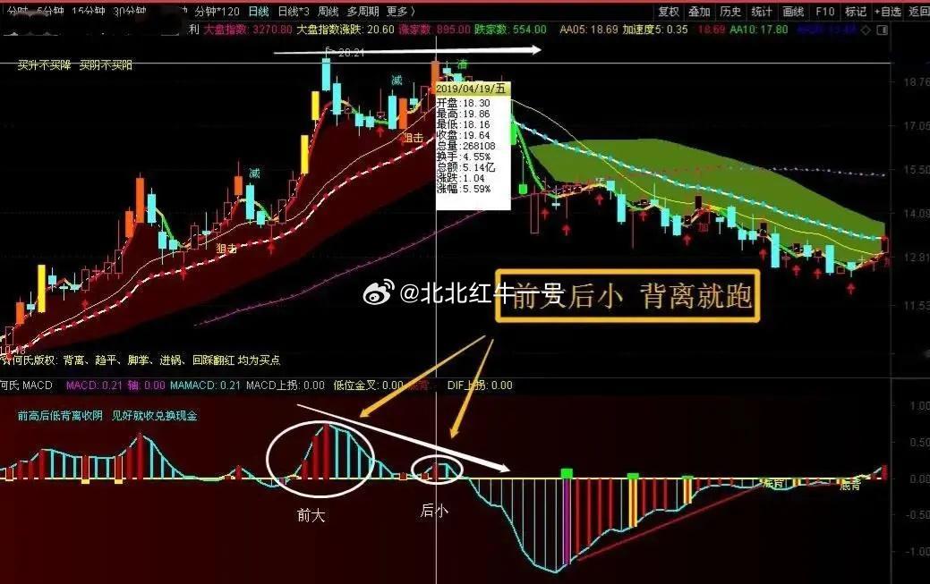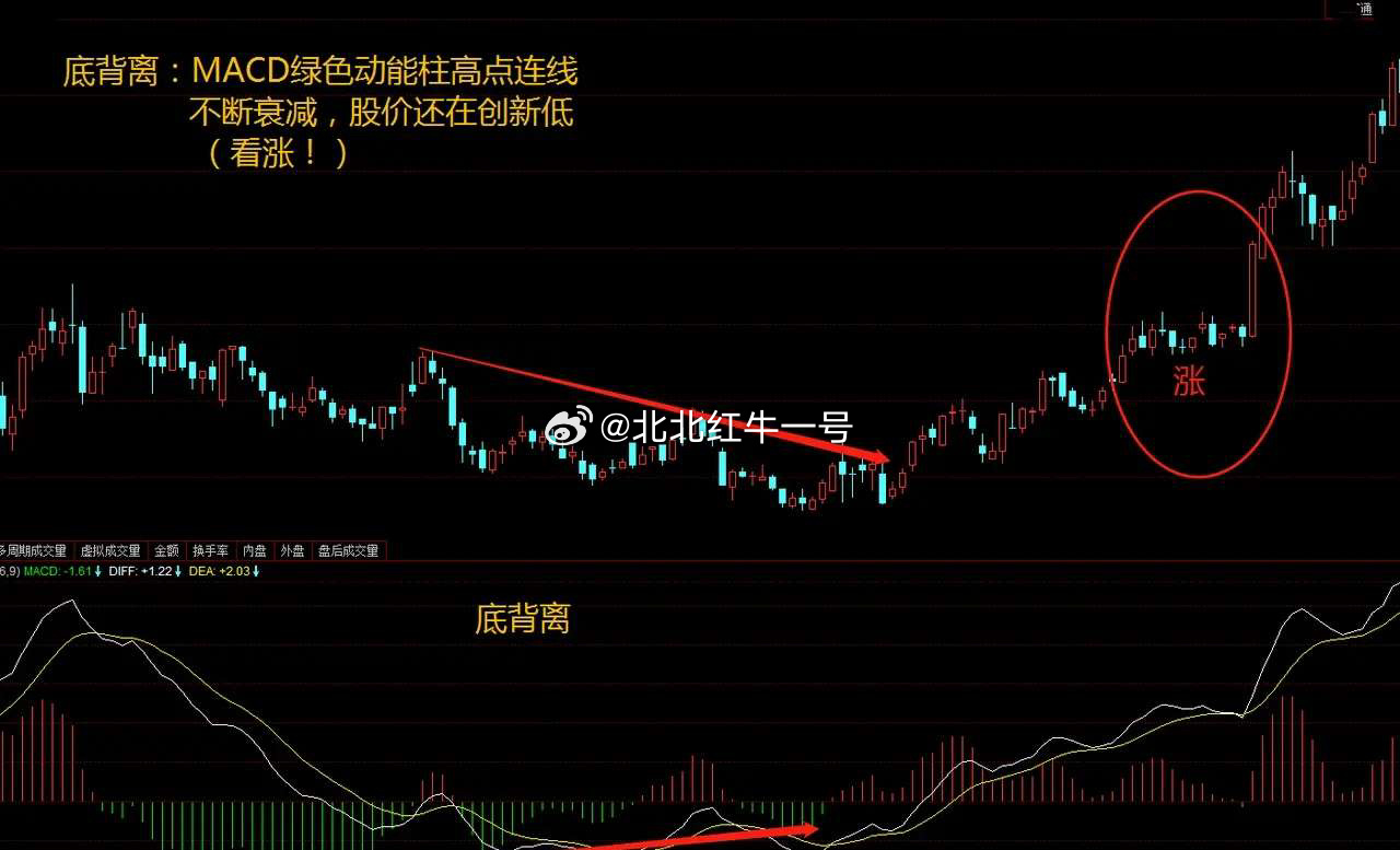 终于有人把MACD指标说透了,符合“MACD底背离+金叉”这个形态,果断上车就对了!任何的技术不在于多,而在于精,重要的是要花时间和精力去领悟,有很多朋友觉得MACD指标没用,而忽略了它的用处,MACD称之为指标之王,不管是什么指标也需要他来作为参照,使用的频率也是排名前三高的,判断一天,一周,或者一个月的走势,行情开始的时候可以判断主力各种情况,也能用他的能量柱买卖,逃顶,抄底等!MACD由DIFF白色线,DEA黄色线,MACD红绿动能柱和零轴线四个部分组成,正常情况白色上穿黄色形成金叉,就是看多的信号,反之亦然,但是这样判断容易出现不够及时的反应,所以我们要运用MACD动能柱的背离判断行情就能大大的增加胜率。简单的理解就是顶背离就是K线的上股票一直在走高上涨,而MACD指标下面的动能却是越来越低,红柱子越来越小,这就就是顶背离的现象,意味着就是逃顶的信号,底背离的话就是刚好与顶背离相反,通常就是我们买入的信号。大道至简,最笨的方法就是认准了形态,总结起来就8个字,买小卖小,缩头缩脚,小就是指红绿住大小,缩头缩脚就是红绿住的长短,形态对了大方向就不会错。看20日线是否往上走,选中之后看30分钟短线,60分钟可以看中长线。运用熟悉之后再加以改进,配合综合运用把胜率更加地提高起来,就可以轻松地把握住一段利润。话不多说,关于MACD的各种形态,无论你是新股民还是老股民,一看就懂,一学就会,大家收藏好!我是北北,只分享最实用的股票干货,感谢点赞。有各种问题都可以在下方评论,抽空我也会一一回复大家