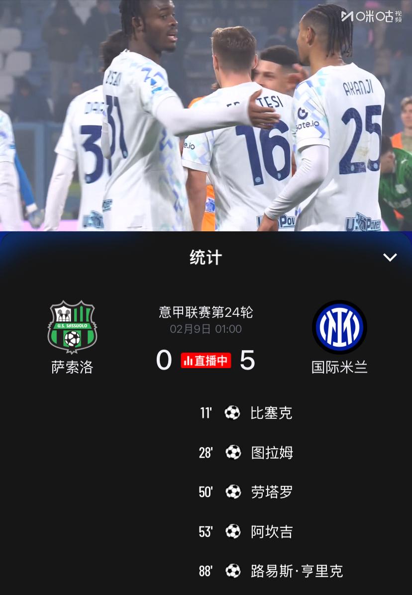 稳得一P!意甲第24轮国际米兰客场5:0大胜升班马萨索洛,迎来联赛的5连胜,比塞克、小图拉姆、劳塔罗、阿坎吉和路易斯·恩里克分别进球,而迪马尔科则上演助攻帽子戏法。取胜后的国际米兰积分来到58分,领先第二名的AC米兰(少赛一轮)多达8分。 本场比赛是个值得庆贺的,除了大胜,就是中后卫阿坎吉和右翼卫恩里克均打进了代表国际米兰的首粒进球,至此本赛季代表国际米兰进球的球员达到了17位。希望恩里克打进首球后能提振自信心,在今后的比赛中踢出自己的特点,助力球队前进。 大胜,无伤,积分差距扩大,主力适当轮休,没有比这更好的结果了。下周末,意大利德比加油,期待本赛季强强对话的不胜魔咒从尤文图斯身上破。