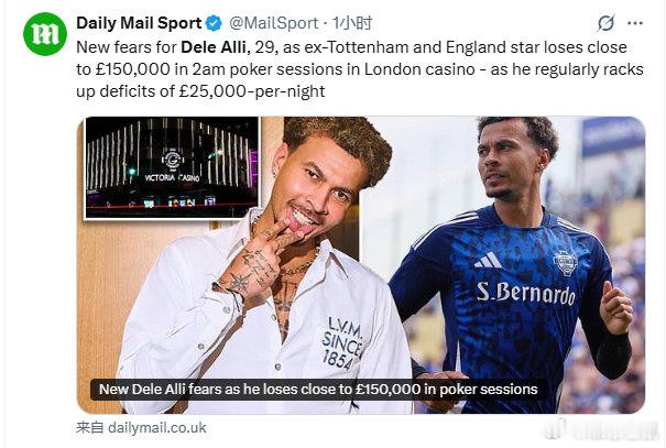 【】《邮报》:阿里在伦敦一家赌场中参加深夜牌局,短短几天内就输掉了近15万英镑。29岁的阿里身价曾经一度达到50M英镑,周薪高达15万英镑,但职业生涯急剧下滑,去年8月与意大利科莫队解约后,回到了伦敦,目前无球可踢。英超
