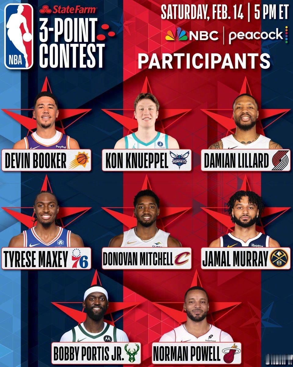 两届三分大赛冠军达米安·里拉德回归!⭐ 鲍比·波蒂斯(雄鹿)⭐ 贾马尔·穆雷(掘金)⭐ 康·克尼普尔(黄蜂)⭐ 诺曼·鲍威尔(热火)⭐ 泰雷斯·马克西(76人)⭐ 多诺万·米切尔(骑士)⭐ 德文·布克(太阳)⭐ 达米安·利拉德(开拓者)