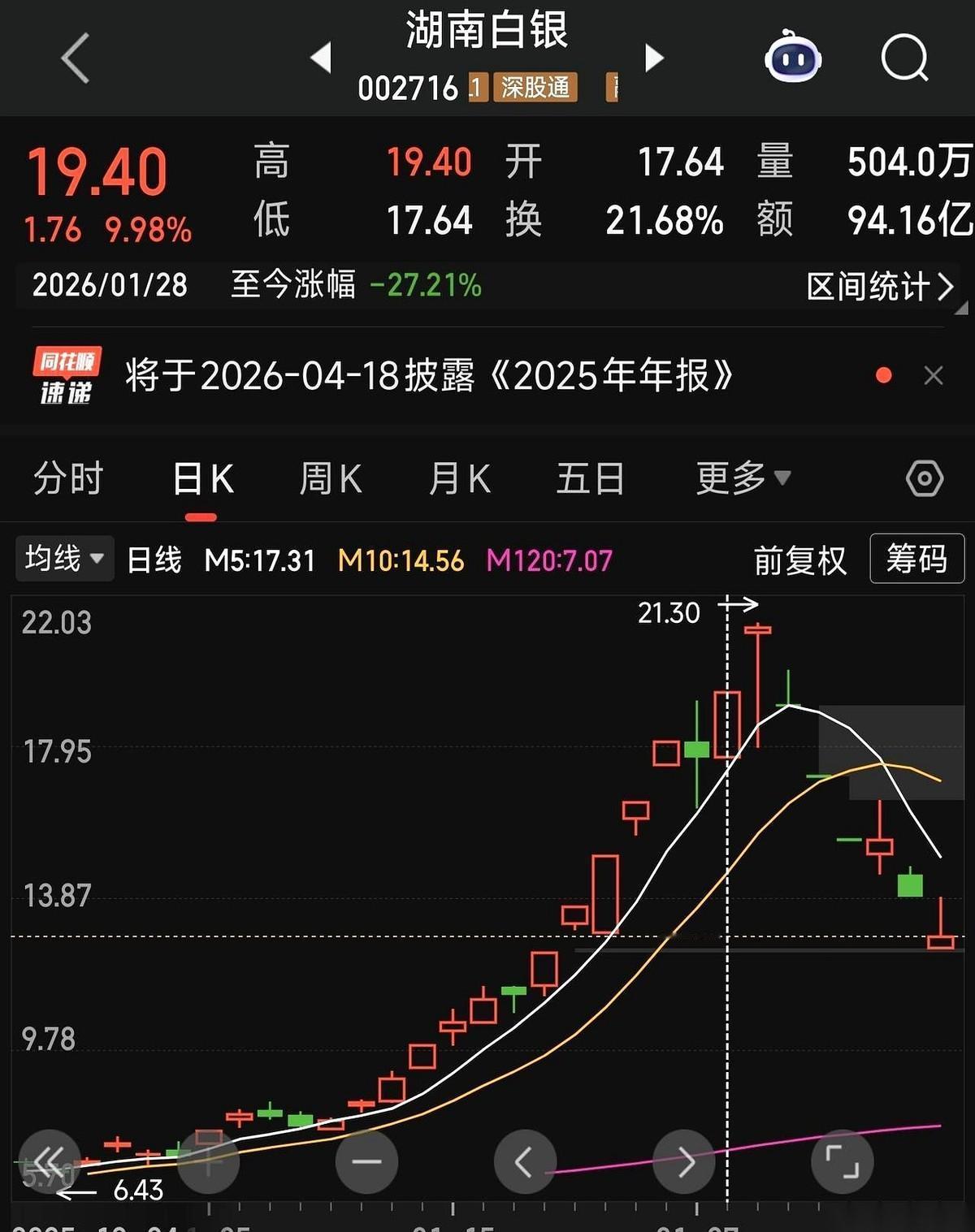 我一朋友,栽在湖南白银上了。 1月28号,眼瞅着那根通红的柱子死死封在涨停板上,他眼睛都亮了,猛地一拍大腿,直接杀了进去。 第二天我问他,他脖子一梗,手机往桌上用力一磕:“没事!这才刚开始,后面有的是行情!” 结果呢?行情没来,账面先绿了。 那根线,就像从山顶上被人一脚踹了下来,笔直往下掉,连个弯都不带拐的。他一开始还撑着,每天点开软件几十次,嘴里念叨着“技术性回调”。 后来,话越来越少,饭桌上就听见他一声接一声地叹气,手机屏幕划开,就那么盯着看几秒,又默默锁上。 那玩意儿从6块钱一路冲到21块,等于一场宴席所有人都吃饱喝足了,他偏偏是在最高点,抢着上去给所有人站岗放哨的。就这么眼睁睁地看着它,一天,两天,一周,像个漏了气的皮球慢慢瘪下去,想跑,又总觉得下一秒就能弹回来,结果就是这么一犹豫,连逃跑的门都焊死了。 说白了,人家酒席吃完了,桌子都撤了,你才冲进去抢着要买单。 这买的哪是单,是活生生的教训。