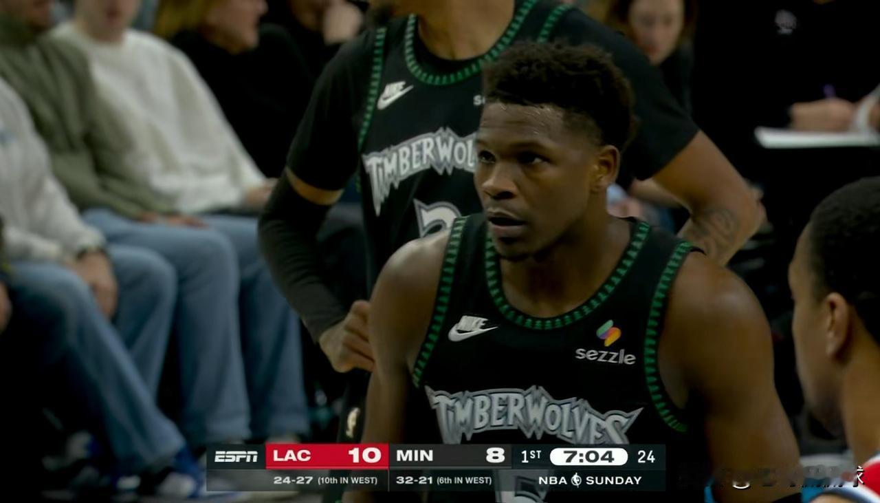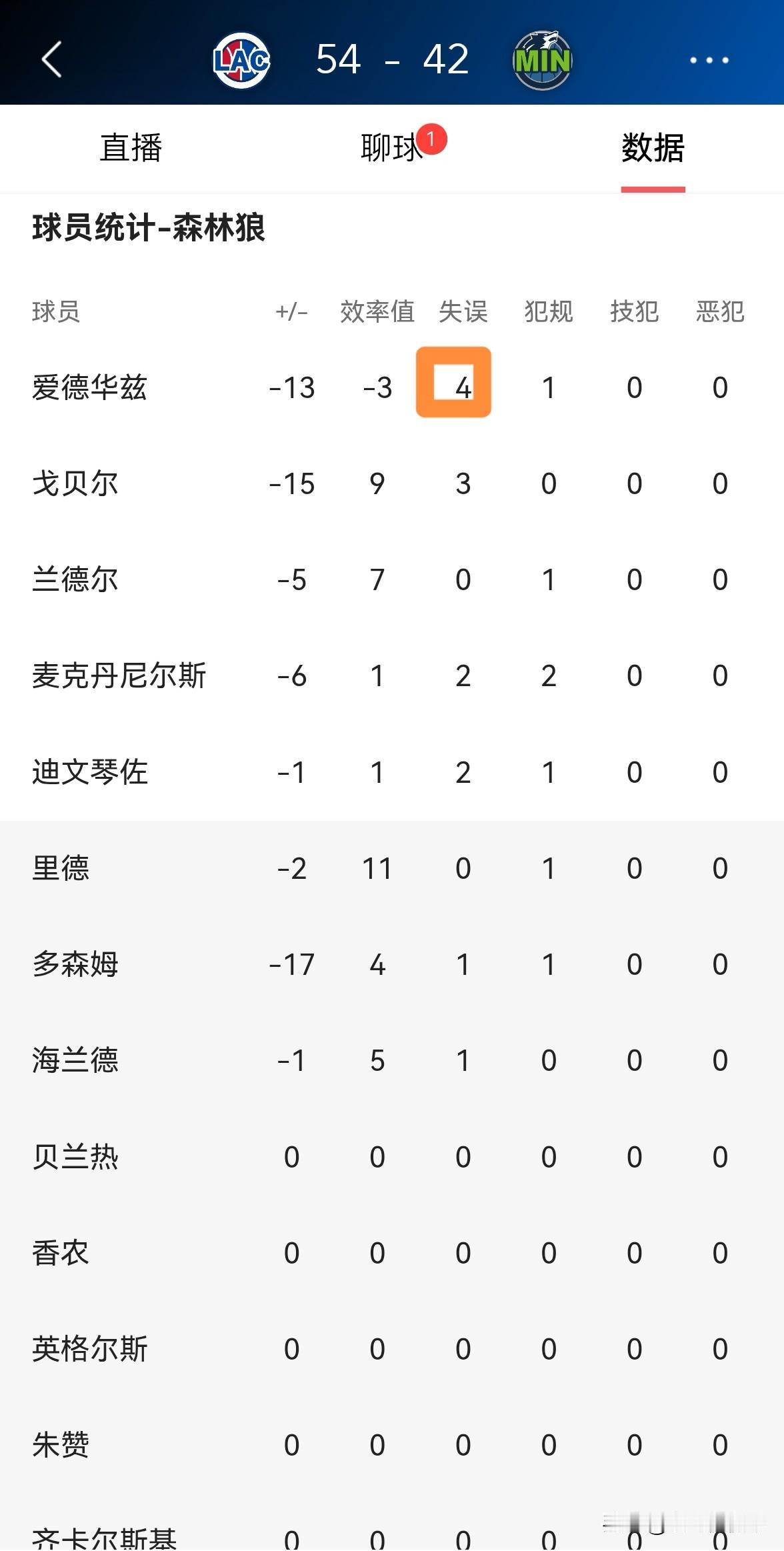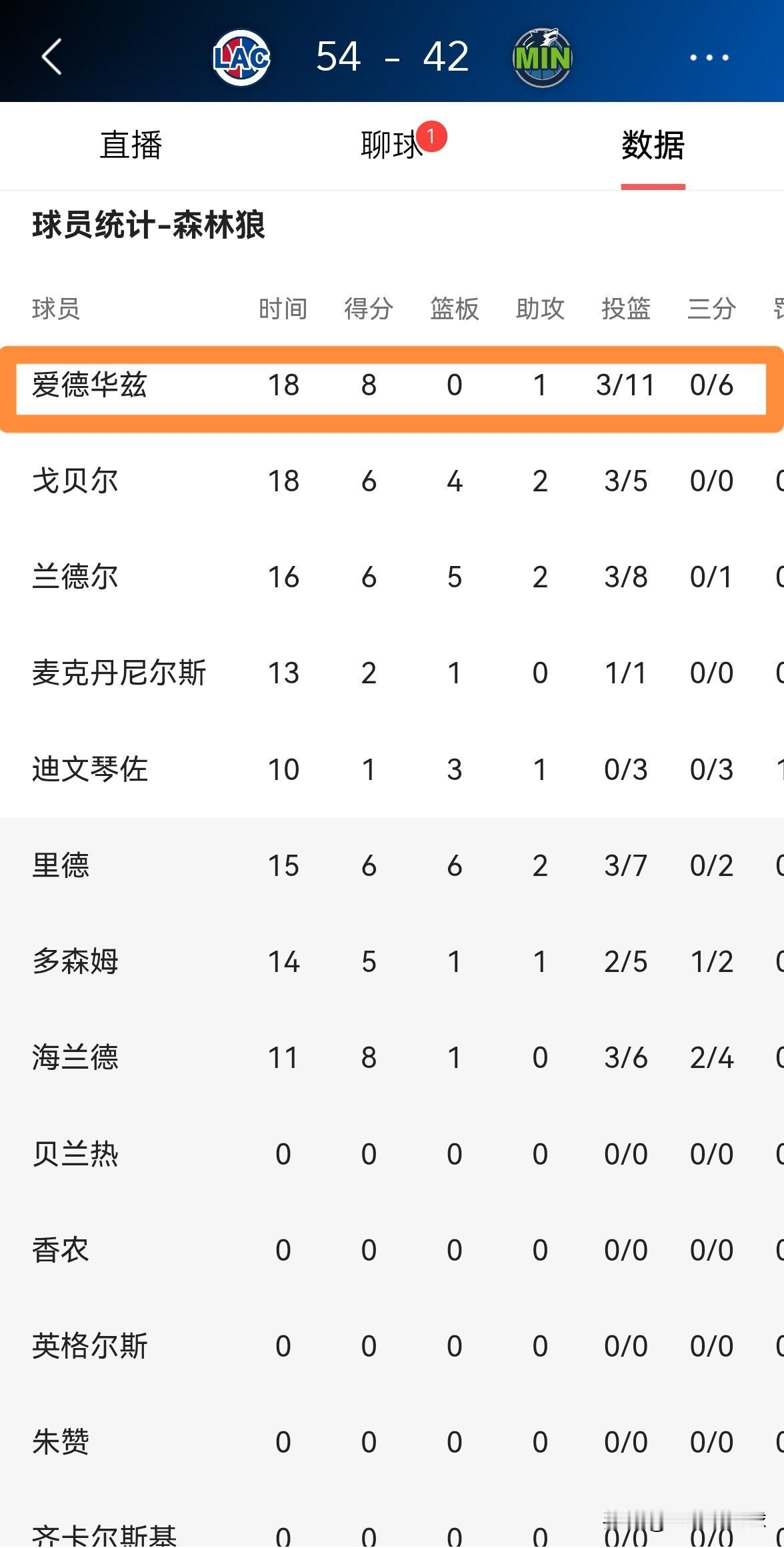 森林狼巨星爱德华兹真是非常的拉胯!在今天森林狼主场迎战快船的比赛中,目前两队的上半场比赛已经结束,森林狼以42:54落后对手12分。在前两节比赛中,爱德华兹的表现真是一塌糊涂,他不仅三分手感冰凉,而且失误不断。 在上半场比赛中,爱德华兹首发出战18分钟,投篮11中3,其中三分球6中0、罚球2中2非常低效的得到8分,还出现了全队最多的4次失误,他的场上正负值为-13。 作为森林狼的当家球星,爱德华兹在上半场比赛中的表现简直是惨不忍睹。如果爱德华兹无法在下半场比赛中及时苏醒的话,森林狼必败无疑。