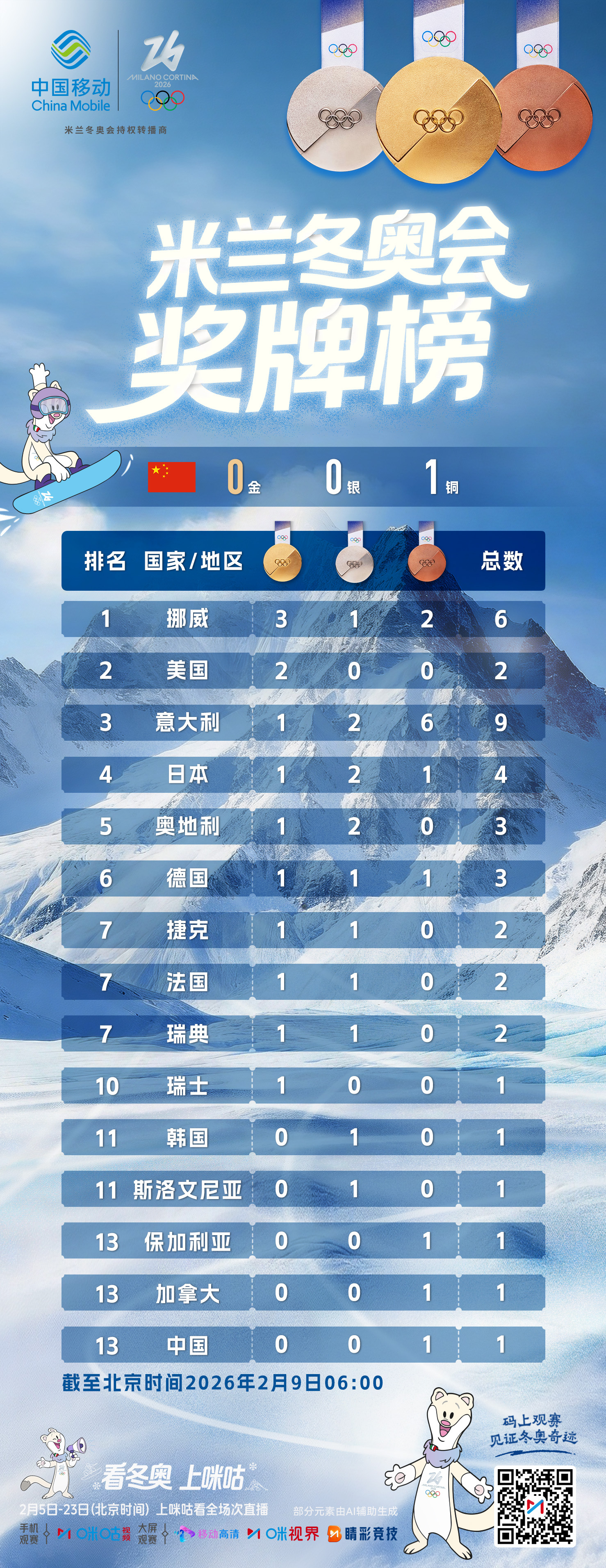 🥇🥈🥉奥林匹克奖牌榜𝗠𝗲𝗱𝗮𝗹 𝗧𝗮𝗯𝗹𝗲#米兰冬奥花滑首金诞生##看冬奥上咪咕##热雪新年转出奇迹#🔗网页链接