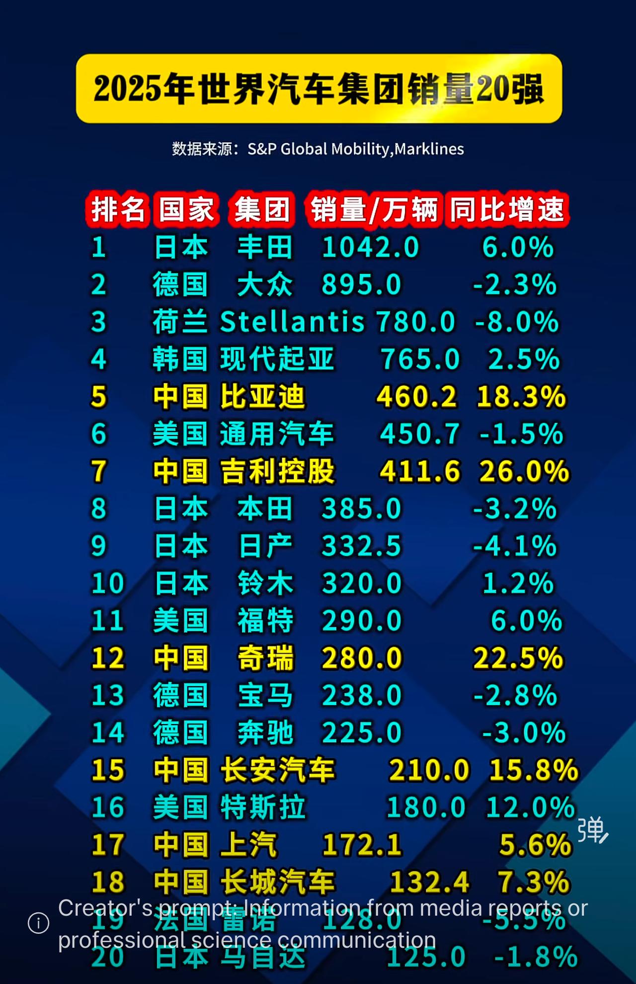 2025年全球汽车集团销量前三甲为:日本丰田(1042万辆,+6.0%)、德国大众(895万辆,-2.3%)、荷兰Stellantis(780万辆,-8.0%)。 中国车企崛起显著。 榜单中共有6家中国车企,是上榜数量最多的国家。其中比亚迪以460.2万辆稳居第五,吉利(411.6万辆,+26.0%)、奇瑞(280万辆,+22.5%)增速领跑全榜,长安(210万辆,+15.8%)同样表现强劲。这表明中国品牌在全球市场正快速扩张。 对比之下, 多数传统巨头增速放缓或出现负增长。电动车巨头特斯拉以180万辆位列第16,保持12%的稳健增长。 总体而言, 榜单格局呈现“东方崛起,传统承压”的态势,中国汽车工业的集团化优势与增长动能尤为突出,正在重塑全球竞争版图。