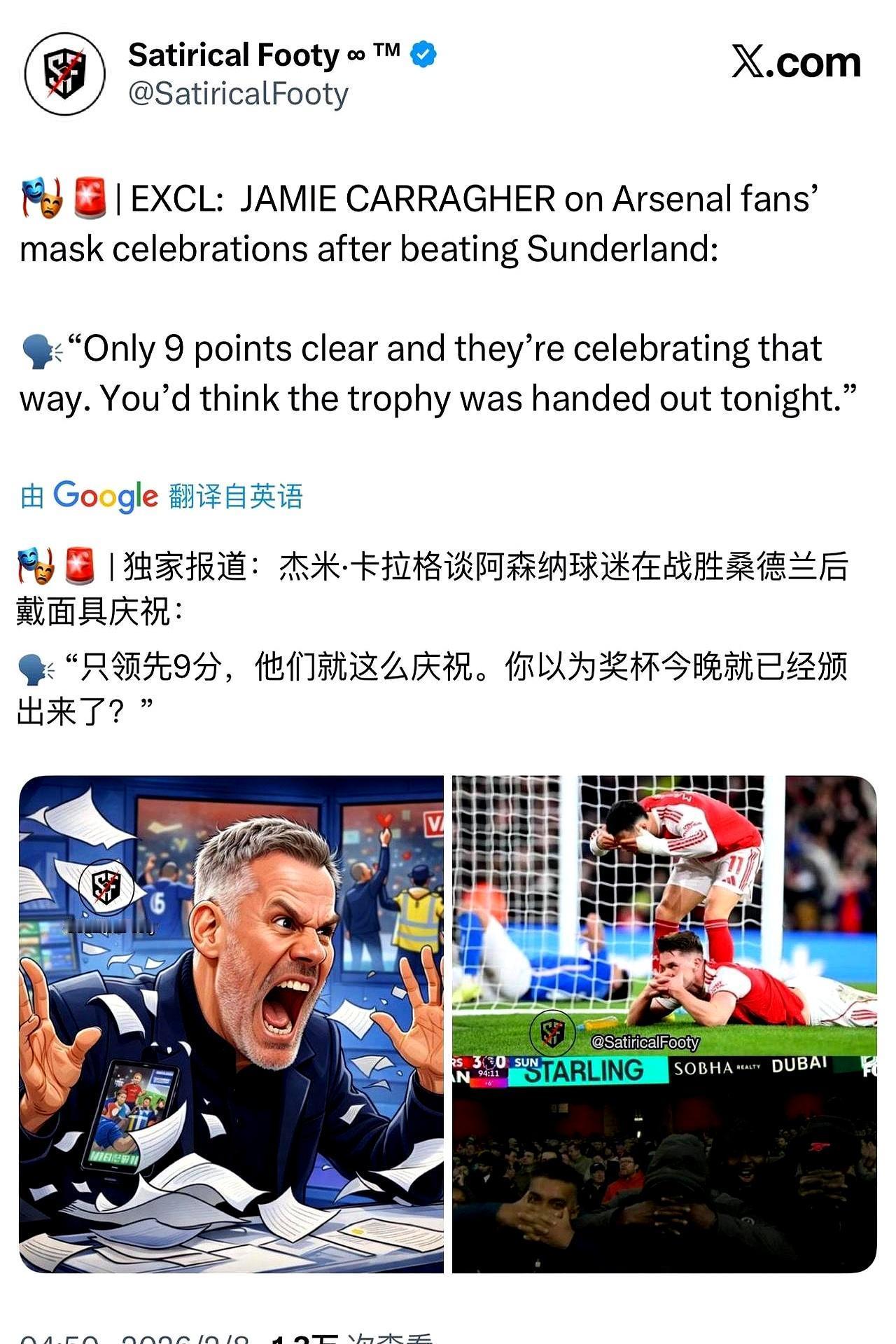 卡拉格又急了:领先9分有什么好庆祝的? 英超甩开曼城9分,20年来最大优势。欧冠更是踢疯了,8战全胜,创造历史。人家球员在场上拼命,赢了球跟球迷互动一下,怎么了? 都二月份了,这势头谁看不出来?非要等到奖杯举过头顶才肯松口?我看不是庆祝过分,是有些人心里过不去这个坎。 说到底,是不是自己主队没这本事,才见不得别人好?