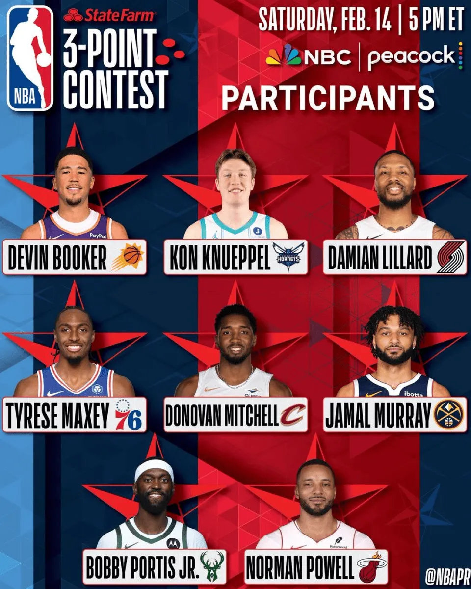 NBA官方宣布了全明星三分大赛参赛名单,赛季报销的利拉德惊喜入选。