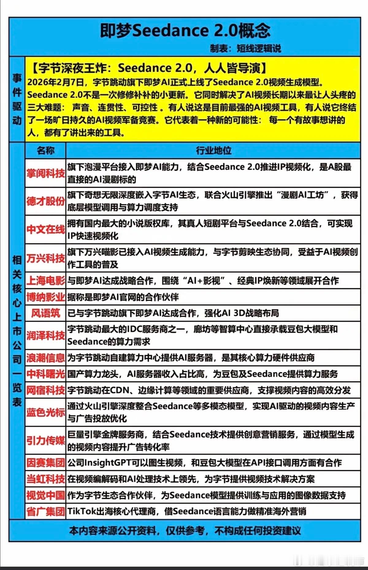 2月7日深夜,字节跳动旗下即梦AI正式上线了,推出Seedance 2.0视频生成模型!能够实现人人皆是导演的梦想!相关核心龙头股: