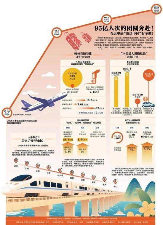 21世纪经济报道:2026年春运期间,“反向过年”模式升温。2月初至中下旬,相关机票预订量同比增长84%,一线及新一线城市成为热门目的地。高铁网络日趋完善,为探亲及旅行提供了便捷选择。2025年铁路旅客发送量达42.55亿人次,“反向流动”正成为拉动沿线消费与区域协同发展的新动力。