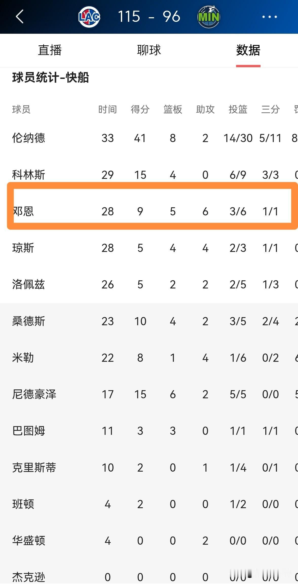 我必须要怒赞快船大将邓恩!今天快船在客场以115:96大胜森林狼,取得了一场酣畅淋漓的胜利。本场比赛,邓恩首发出战28分钟,投篮6中3,其中三分球1中1、罚球2中2得到9分,还有5篮板6助攻1抢断,他的场上正负值为全队最高的+29。 虽然本场比赛邓恩的得分不高,但是他在攻防两端都为球队提供了非常大的帮助,尤其是在防守端和组织串联方面贡献巨大。