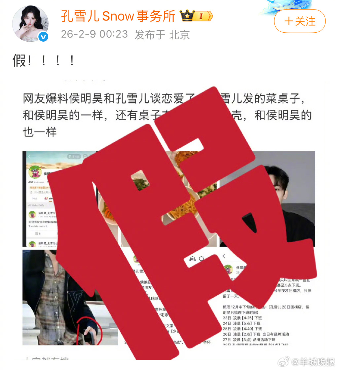 【#曝侯明昊孔雪儿恋情##侯明昊孔雪儿辟谣恋情#】#孔雪儿方否认与侯明昊恋情##孔雪儿工作室辟谣# 2月8日,网传疑似恋情引发网友热议。9日凌晨,发文打假,否认恋情传闻。随后也发文辟谣了。