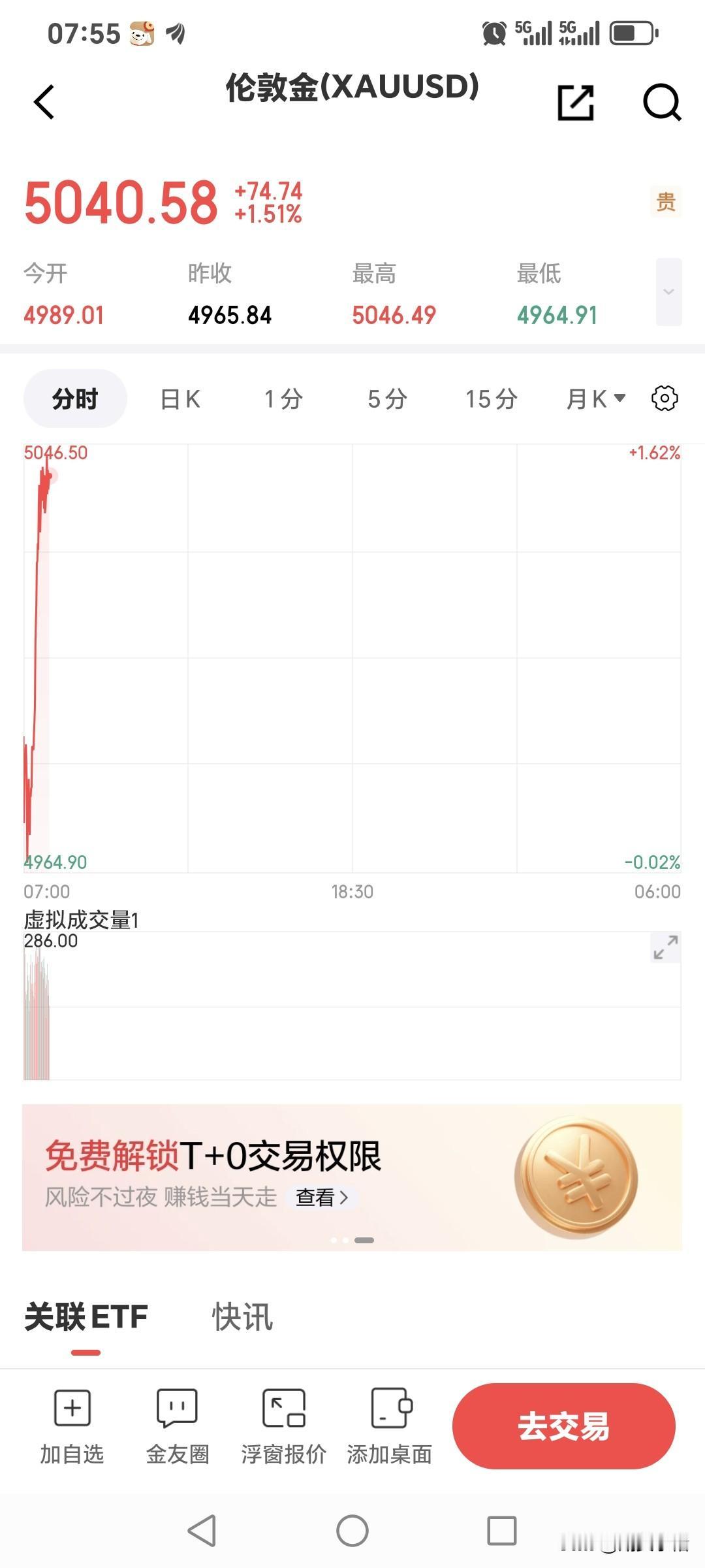 早上, 伦敦金如期大幅上涨, 现在报价5040.48美元, 较上一日上涨74.74美金。 要是周五晚上, 突破5000美元就好了, 就差一点。 不过早上这么猛, 这是奔着5050美元上方去了。 看来,这周上供5150概率增加!