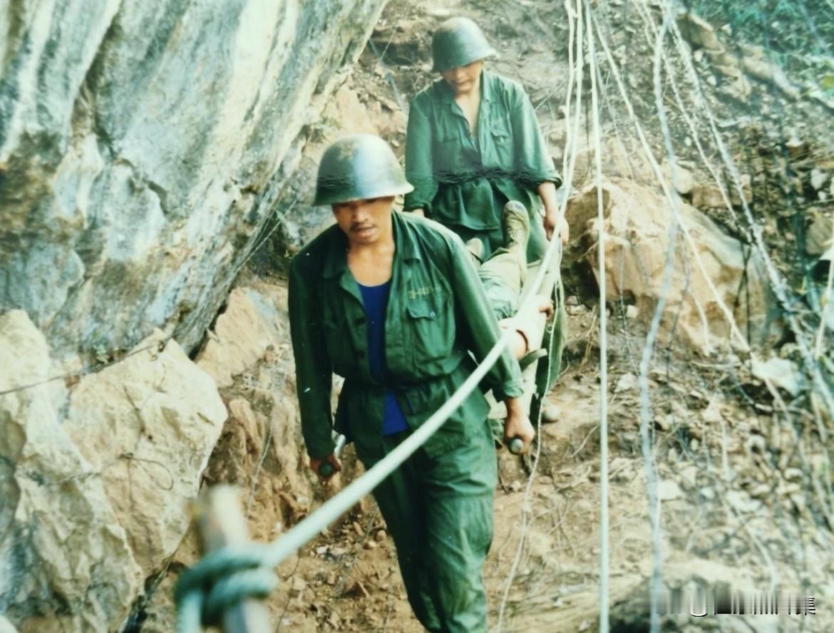 中越战争期间,军工战士转移抢救伤员的场景,非常的艰苦。他们常常是前送后运,不但要把伤员背出前线,还要在极短的时间内把伤员送回后方医院。有时为了抢运一个伤员,他们会在山路上跪地挪动,耗费数小时的艰苦努力,展现了极高的专业素养。