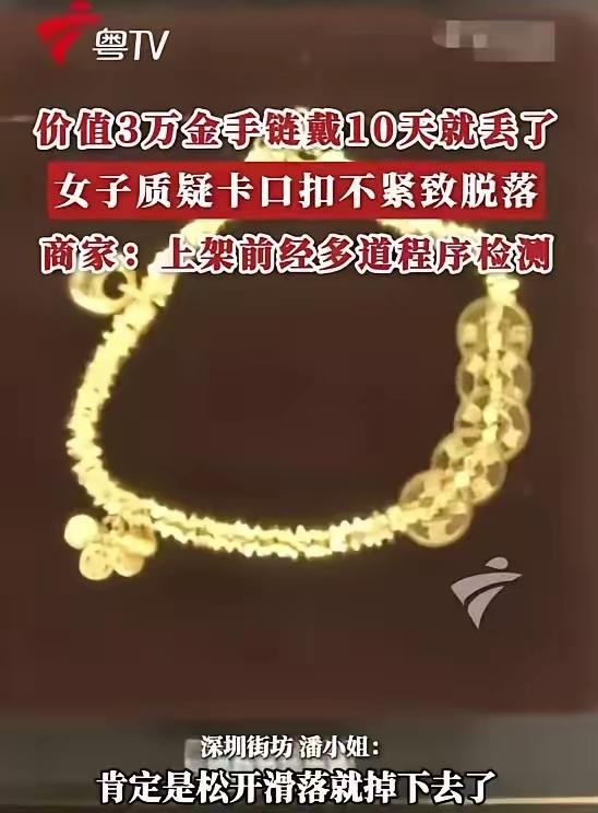 3万块的金手链戴了还不到10天,链子就不翼而飞了! 潘女士气冲冲找到店家讨要说法,坚称是卡扣设计有问题才导致脱落的,店家却坚持说产品出厂前经过了好几道严格的质检,绝对没问题。 双方各执一词,这事您怎么看? 那天潘女士咬咬牙花了整整3万块,把这条自己心心念念的金手链带回了家。戴上新手链那天,她简直喜欢得不得了,连晚上睡觉都没舍得摘下来过。 同事们见了都夸好看,她心里更是乐开了花,谁能想到,戴到第十天,早上准备出门时,一摸手腕才发现链子不见了,空空荡荡的。这时候她才猛然想起,之前戴的时候就觉得卡扣有点松,当时没在意,现在想来,恐怕就是这个小问题害的。 店家拿出了同款式的手链试戴了好几次,反复强调产品绝对没有质量问题。可3万块就这么花出去了,换谁心里不憋屈啊?这事在网上也炸开了锅,网友们的评论分成了两派:有人说再贵的东西也难免有小瑕疵,店家应该负责赔偿;另一部分人觉得贵重首饰出厂都经过好几道质检,会不会是潘女士自己佩戴的时候不小心弄丢的呢? 那这3万块钱,到底该不该让店家退呢?生活里要是遇到这种糟心事,您一般会怎么处理呀?丢金手链 项链失而复得 黄金链子 假金项链骗局 黄金手链丢失 黄金项链失窍案 2万8的项链