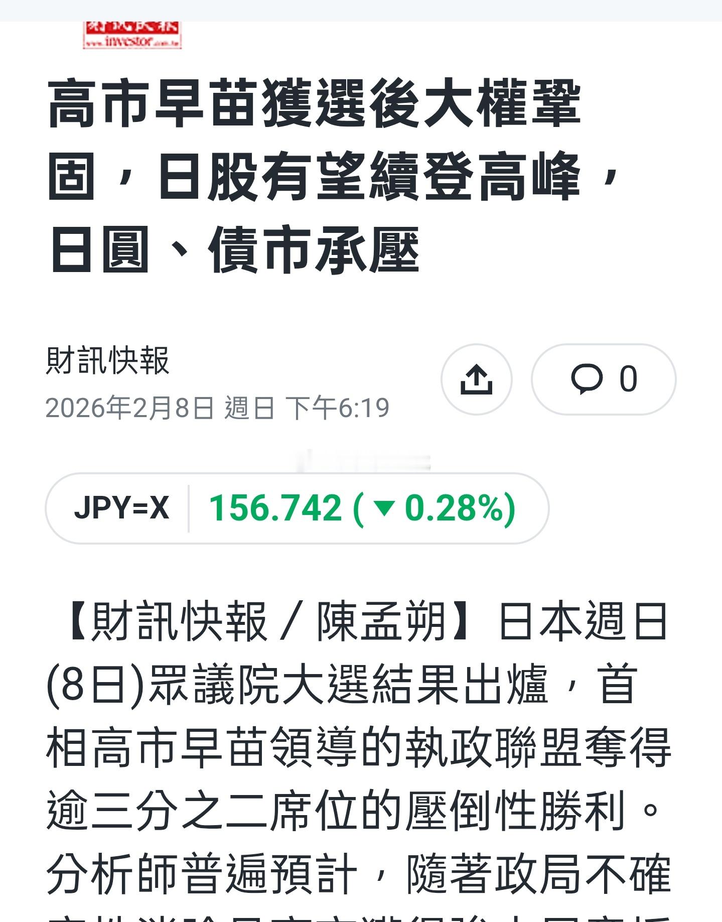 既然日本人民选择了高市独大的剧本,我也盲猜下接下来的剧情:(1)日本的财政纪律彻底喂狗,贸易赤字压不住,日元只能像断了线的风筝往下掉。政府没别招,只能一边印钱补贴日元贬值带来的窟窿,一边继续给那帮僵尸企业输液。央行就算加息,那点幅度在贬值面前也是毛毛雨。结果就是 Carry Trade 2.0 开启:华尔街和日本财团赚到手软,日经、美股、币圈集体上天。