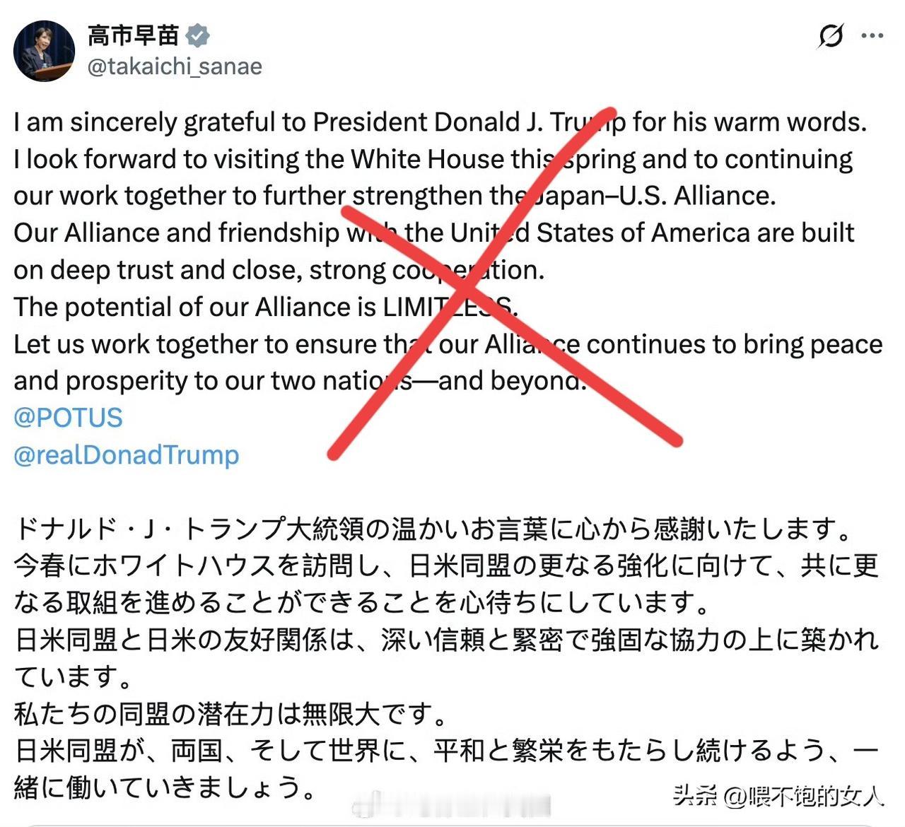 奇了怪了,我这最后评论不香吗?非要去看主流媒体的? 高市继续执政后给特朗普发帖子: “我由衷感谢川普总统的温暖话语。我期待今年春天访问白宫,继续携手合作,进一步加强日美同盟。 我们与美国的同盟与友谊,建立在深厚的信任和紧密、强大的合作之上。我们同盟的潜力是无限的。 让我们共同努力,确保日美同盟继续为两国乃至世界带来和平与繁荣。” 评两句:从高市早苗这帖子可以看出,她认为她的继续执政特朗普是帮了忙的,毕竟在众议院选举之前,特朗普也亲自发了一个帖子表示支持她继续当选,并呼吁有选票者给他她投票。所以高市第一时间给特朗普发了帖子。目前来看还没有看到特朗普政府的反应。 至于她希望继续跟美国合作,让美国给日本带来繁荣。这也只不过是演戏罢了。能带来什么繁荣?美国政府现在看上去就是索要性政府嘛?