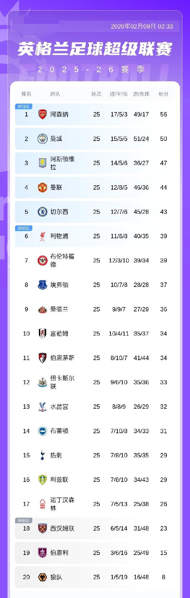 英超积分榜:曼城绝杀利物浦积50分仍第2,阿森纳56分领跑!利物浦积39分排第6 2月9日 英超第25轮全部结束 利物浦1-2不敌曼城 积分榜上:阿森纳积56分领跑,曼城积50分第2,维拉积47分第3,曼联积44分第4,切尔西积43分第5,利物浦积39分第6