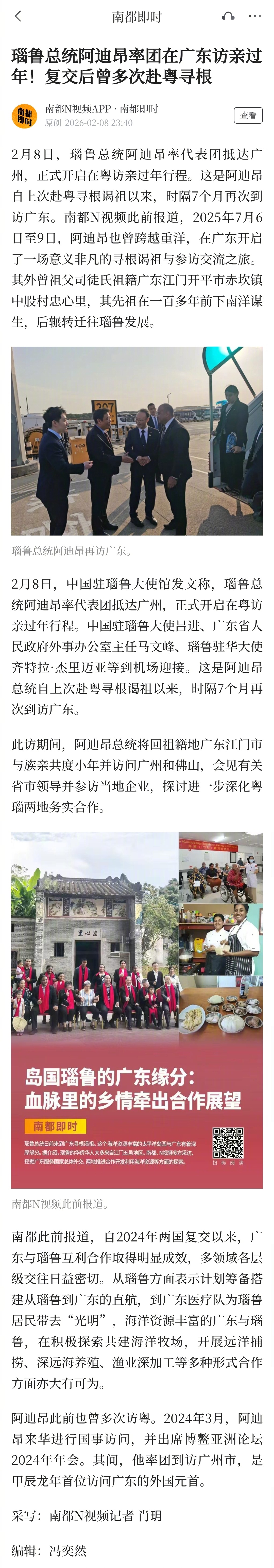#瑙鲁总统来广东访亲过年#【瑙鲁总统阿迪昂率团在广东访亲过年!复交后曾多次赴粤寻根】#瑙鲁总统曾多次赴粤寻根#2月8日,瑙鲁总统阿迪昂率代表团抵达广州,正式开启在粤访亲过年行程。这是阿迪昂自上次赴粤寻根谒祖以来,时隔7个月再次到访广东。南都N视频此前报道,2025年7月6日至9日,阿迪昂也曾跨越重洋,在广东开启了一场意义非凡的寻根谒祖与参访交流之旅。其外曾祖父司徒氏祖籍广东江门开平市赤坎镇中股村忠心里,其先祖在一百多年前下南洋谋生,后辗转迁往瑙鲁发展。