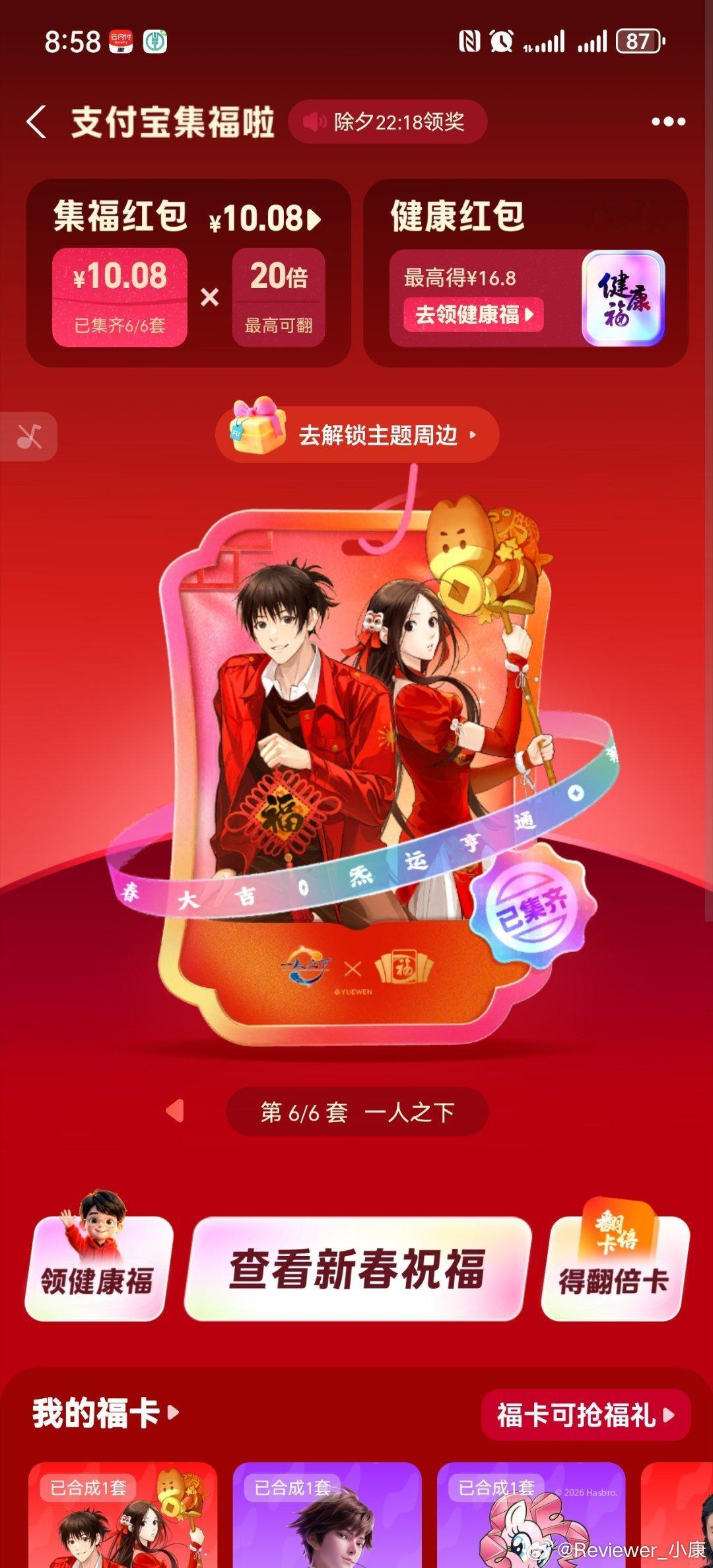 支付宝集福,没意思,抽不到稀有卡。最后集齐了,是因为有2套是买东西给卡的。