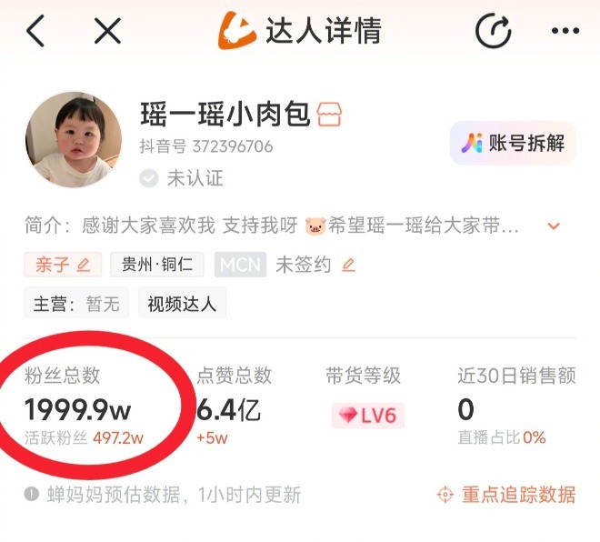 2月9日,大皖新闻记者从第三方平台看到,2025年2月12日,“瑶一瑶小肉包”粉丝量达到高峰2119.5万,2026年2月9日上午9:00,瑶一瑶小肉包粉丝数为1999.9万,活跃粉丝497.2万,累计一年掉粉119.6万。
