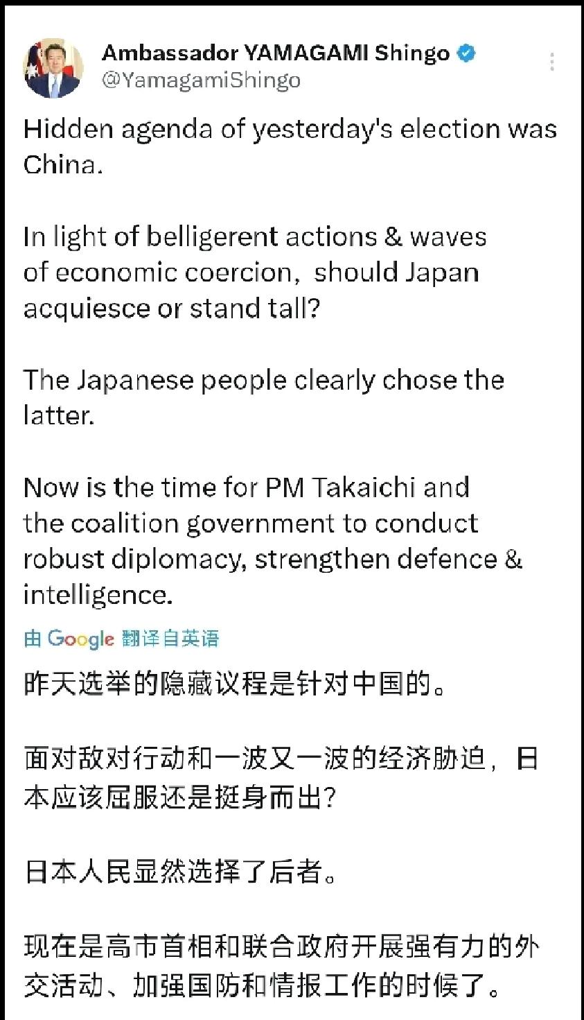 2月9日,日本驻澳大利亚大使,山上信吾发文:“昨天选举的隐藏议程是针对中国的。面对敌对行动和一波又一波的经济胁迫,日本应该屈服还是挺身而出,日本人民显然选择了后者,现在是高市首相和联合政府开展强有力的外交活动,加强国防和情报工作的时候了。” 个人认为:无可否定,日本国内的所谓“这一场胜利”,给日本那些极右翼分子,极大的振奋,所以不可避免的就会发出各种嚎叫。 例如,这位日本驻澳大利亚大使山上信吾,使用了“对抗中国”“经济胁迫”“敌对行动”这些纯属颠倒黑白,恶意栽赃,倒打一耙的行径,个人愿意称之为这是对日本领导层及民众,集体转向右翼思想的服从测试,把那些敢于发出理性声音的人筛选出来,以备日后打压。 真是上边有什么样的上司,下边就有投其所好的下属。有一个善于伪装,惯于喊口号而又毫无实际作为的表演型上司,那么下边就会有主动制造对立,煽动仇外情绪,完全违背外交基本准则的,善于火上浇油的下属。 庆祝日本人所谓的胜利吧,全世界都在关注。