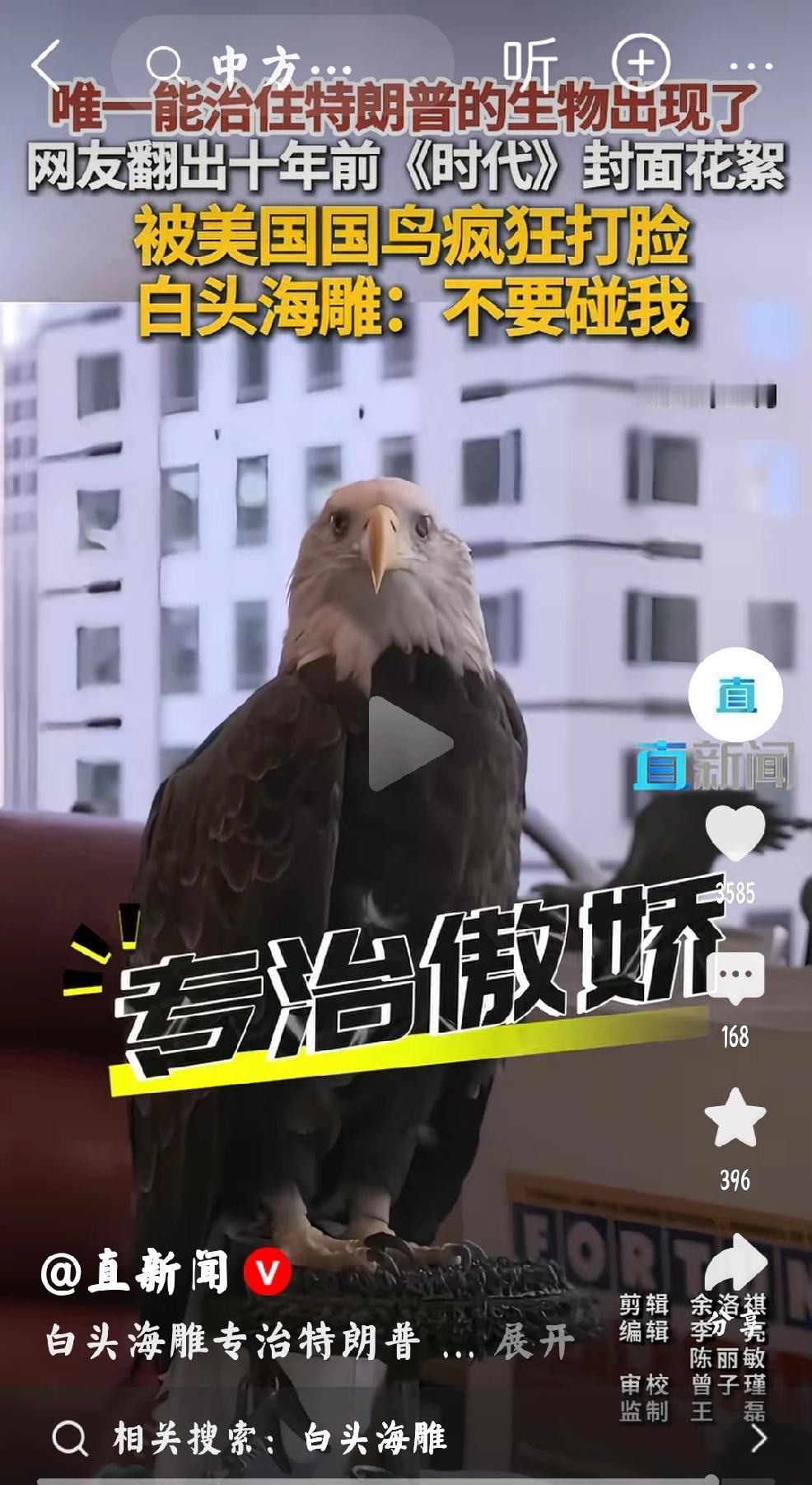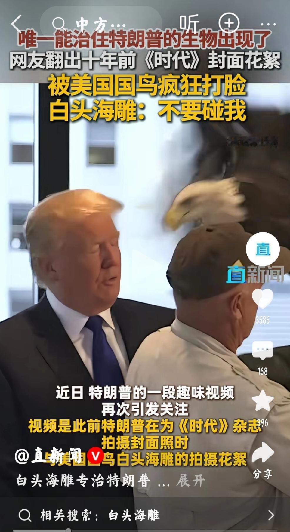 2月8日,直新闻,视频播报,近日,特朗普于2015年12月拍摄《时代》杂志封面的花絮再度火了,全程被美国国鸟白头海雕花式拿捏,果然能治特朗普的,唯有硬核美国国鸟。 个人认为:能够管理特朗普的,还有特朗普的利益。 请牢记一点:特朗普的利益和美国的利益是两回事,当两者冲突时,最优先级的考虑是:特朗普的利益 ,这是毋庸置疑的。 其实美国优先,更准确的说法是:美国总统特朗普优先。