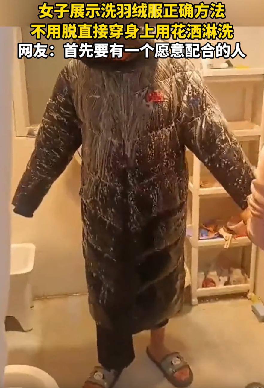 河南,女子看快过年了,就想给孩子的羽绒服洗一下,可放洗衣机怕洗坏了,手洗吧这么一大件实在费劲,于是灵机一动,让孩子把羽绒服穿在身上,她用花洒淋浴来进行清洗,结果却遭到不少网友吐槽:就怕蠢人灵机一动 视频中,孩子老老实实套上那件黑色长款羽绒服,跟妈妈进了卫生间。妈妈拿起花洒,对着羽绒服冲水,又拿搓澡巾在衣服表面上下搓。远远看去,不像是洗衣服,倒像是在给孩子搓澡 对此,有网友说:羽绒服其实并不怕水,怕的是洗衣液的活性成分和洗衣机里那种高强度的搓揉。说到底,羽绒服还是怕被暴力洗涤。妈妈的这个方法看起来是聪明,但实际操作下来,不仅没能保住羽绒服,反而可能让衣服更糟,可以说是精准踩雷了 那么羽绒服到底该怎么洗?其实并不复杂。看洗标是第一步,如果标明可以机洗,就选用轻柔模式,最好再加个洗衣袋;手洗的话,用中性洗涤剂,温水浸泡,轻轻按压就行,切忌拧干或暴晒。洗完后多拍打、阴干,羽绒自然就能恢复蓬松 我觉得,作为妈妈,她的出发点是好的,想给孩子洗干净衣服,这份心意大家都能理解。但从另一个角度来看,很多家务小窍门,最终可能是用错了工具和方法,导致本来能轻松解决的事情反而闹得一团糟 这时候,不妨放慢脚步,看看那些真正的“干货”指南,或者直接查查洗涤标签,找到真正适合的方法