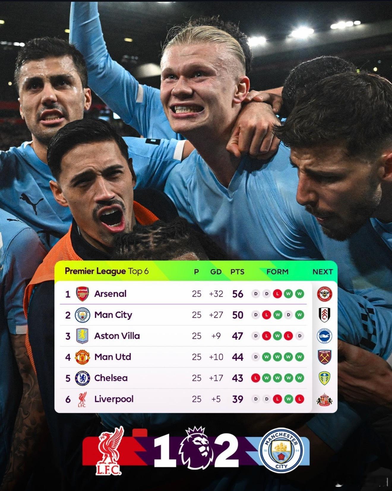 利物浦vs曼城曼城最终还是以 2 比 1 客场击败利物浦,落后榜首仍然是6分。还记得阿森纳是英超第几轮开始6分领跑的吗?答案是第12轮(图二)。现在英超是第25 轮已经打完,阿森纳仍然以 6 分优势在积分榜榜首领跑(图一)。