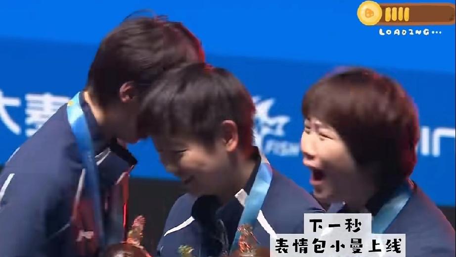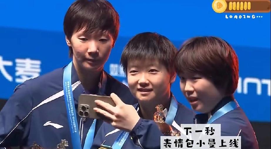 wc! 哈哈,这照片是拍的多漂亮,蒯曼都激动的口吐芬芳了。 看看女单颁奖现场,合影期间蒯曼拿着手机,站最前面,中间是莎莎,后面是曼昱,调整好镜头,大丫头喊321,镜头定格。哇,WC太好看了。 大丫头看着合影,激动的不行。惹的旁边莎莎都笑了。