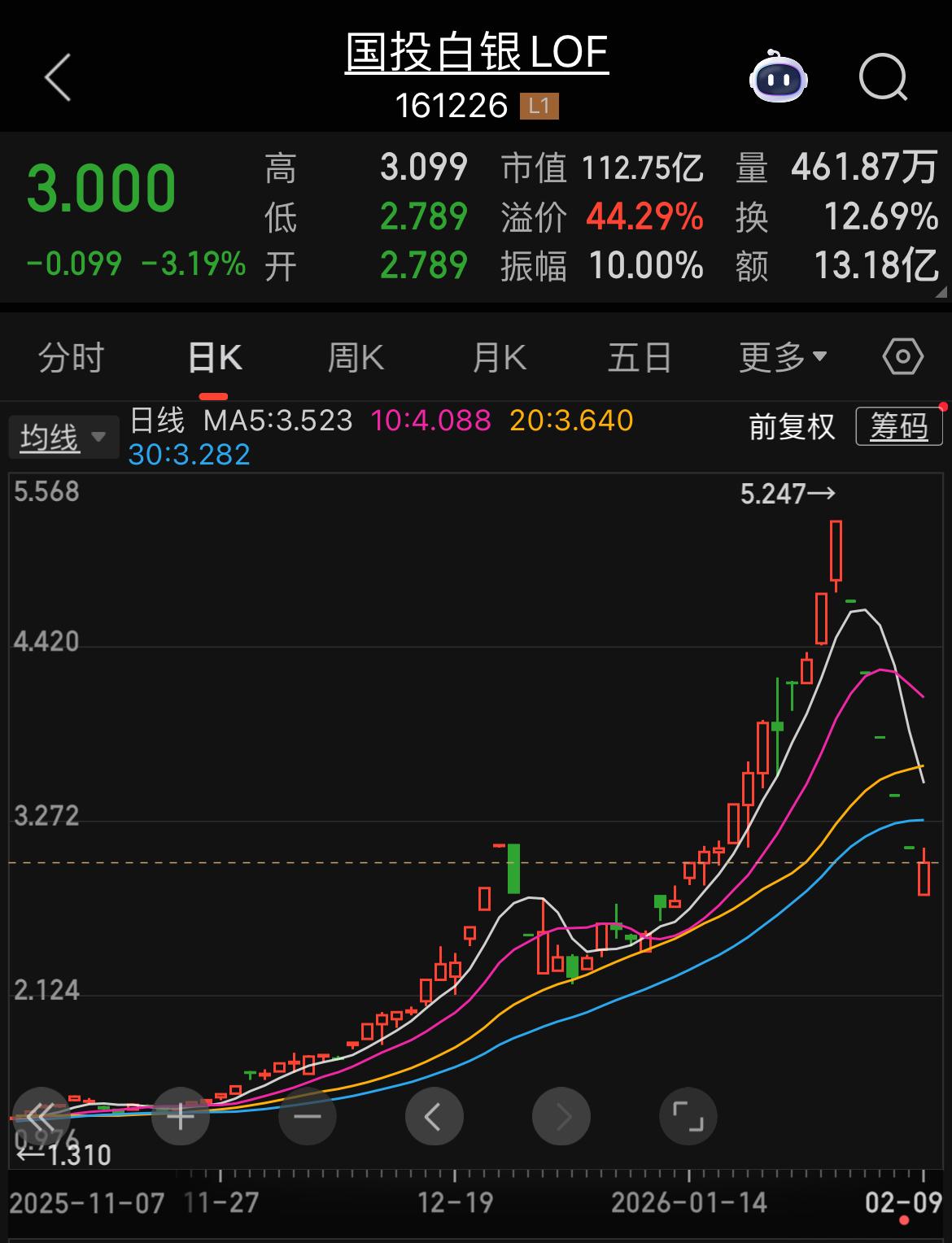 2月9日,国投白银LOF复牌后连续第六个交易日跌停,但盘中一度大幅拉升,逼近翻红。截至发稿,场内溢价率仍高达44.29%,成交额达13.18亿元。 显然,仍有大量资金在押注未来白银价格将强势反弹。然而,对于一只场内溢价接近45%的投资品种,投资者务必高度警惕。理性参与,严控风险,方为上策。
