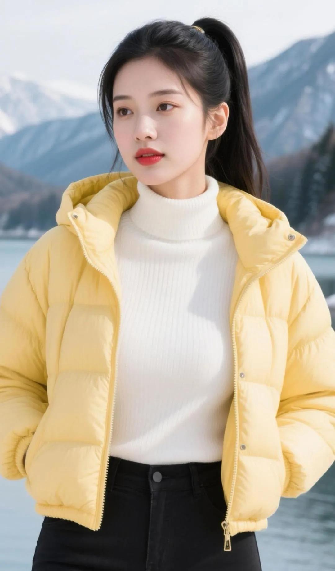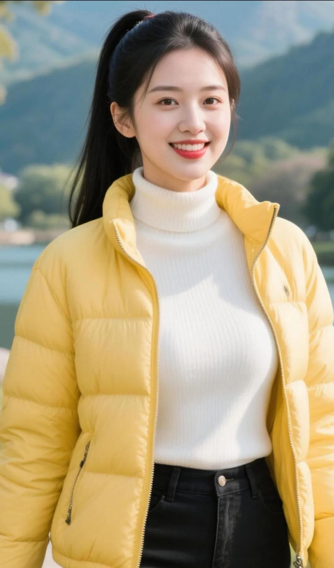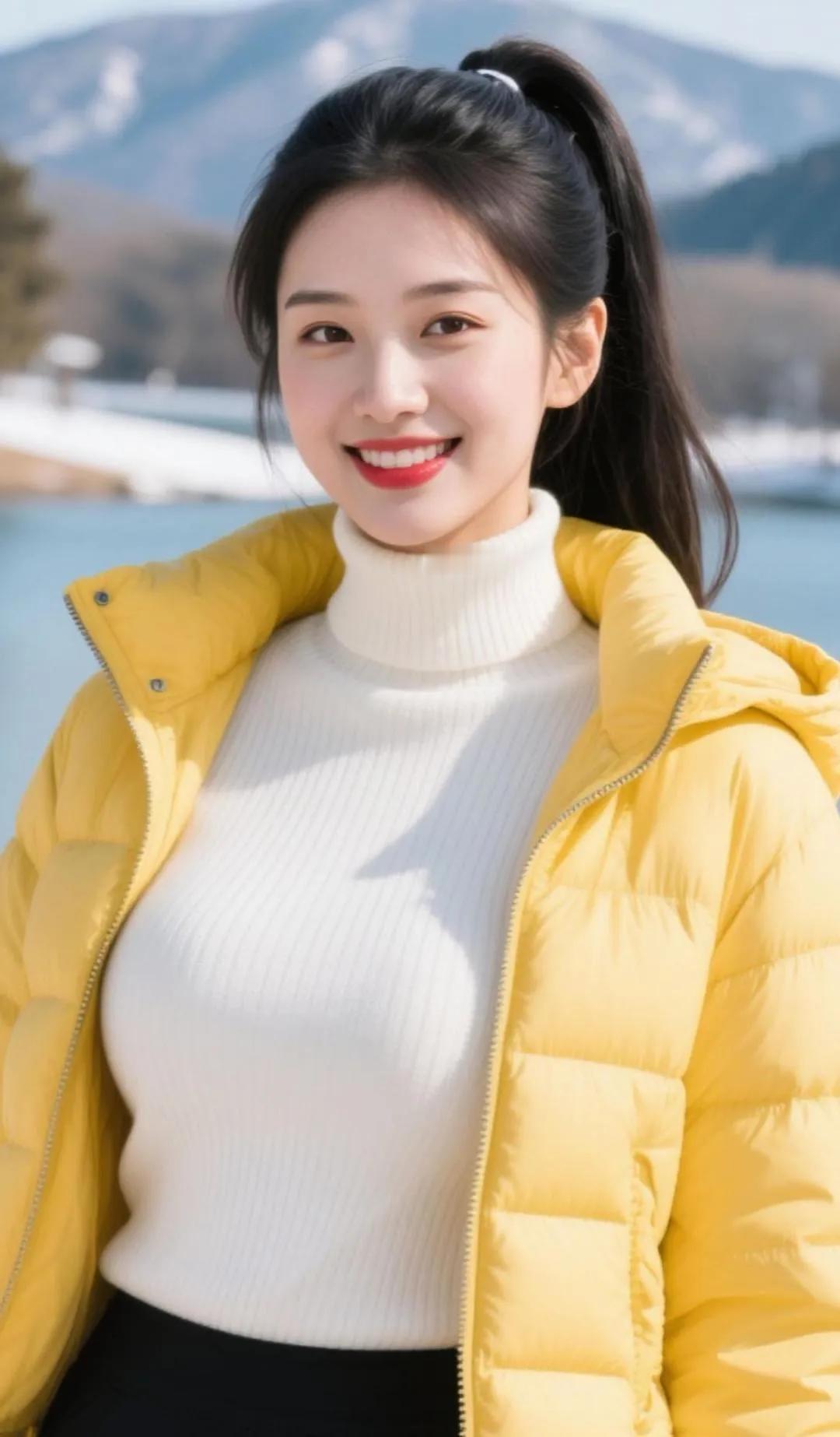 冬日暖阳下,红唇少女与雪景相映成趣。