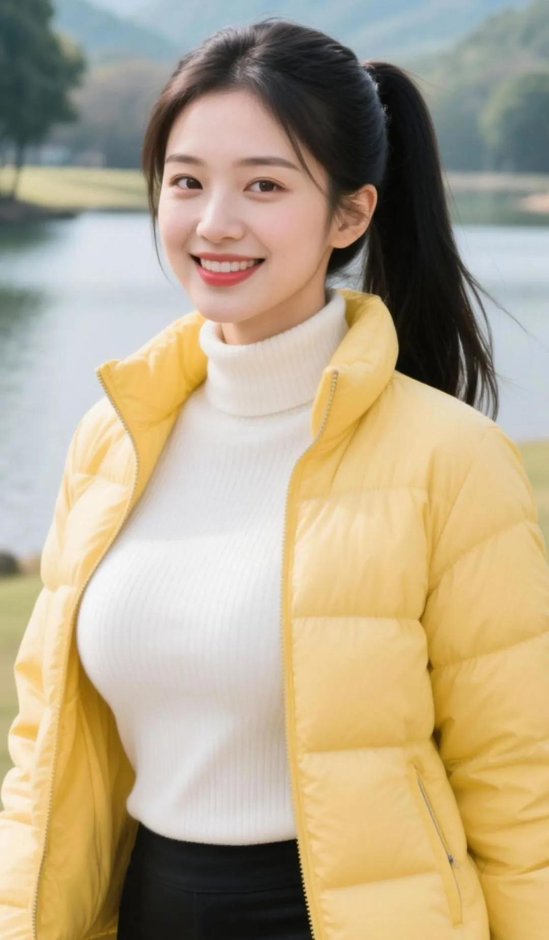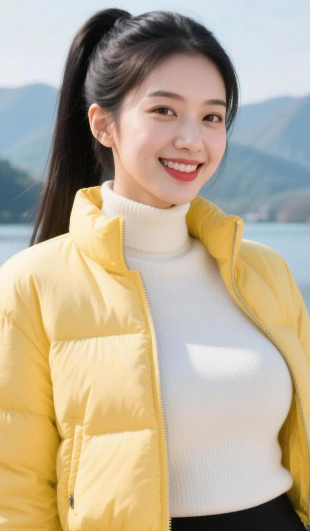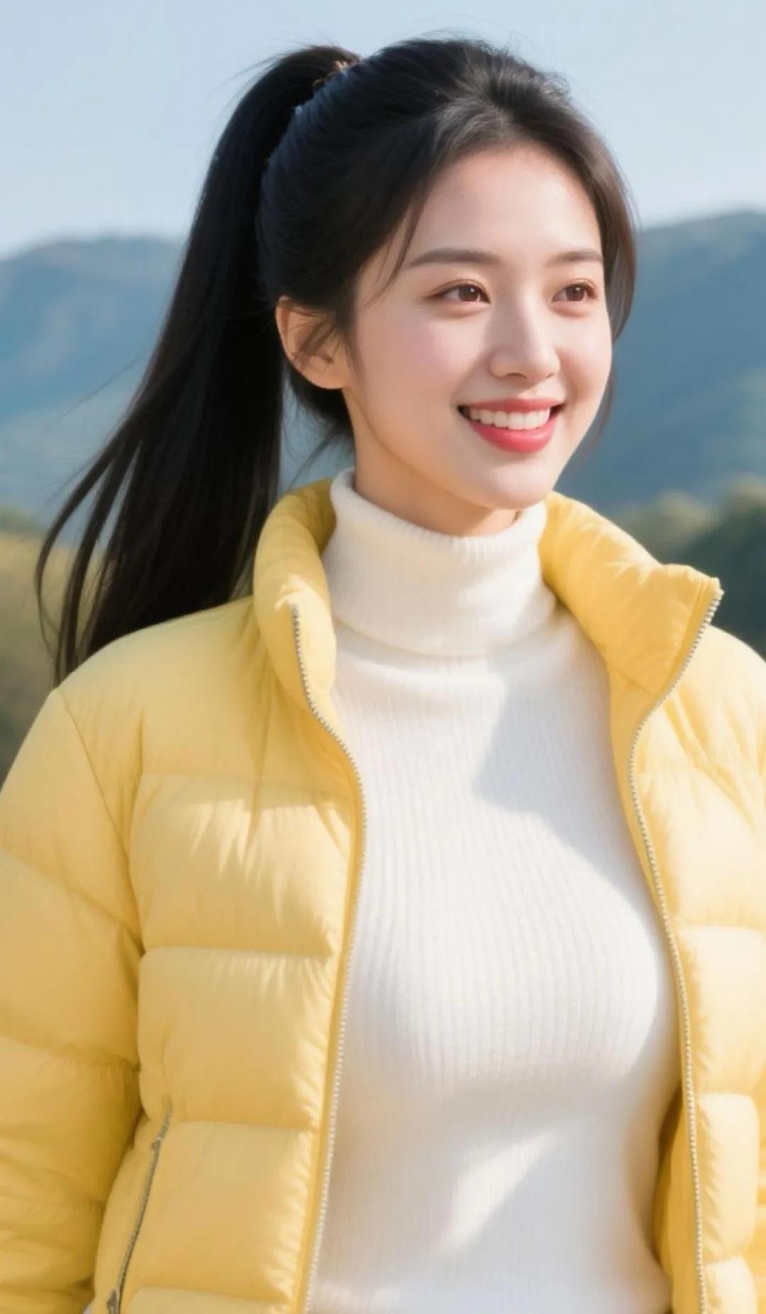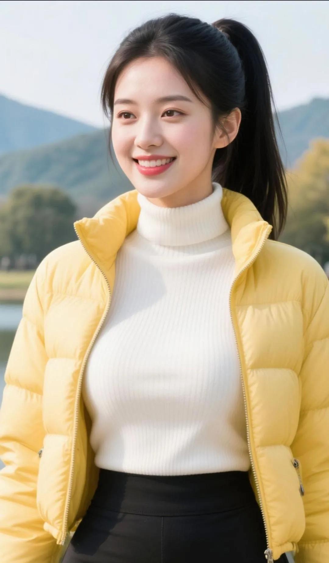 冬日暖阳下,红唇少女与雪景相映成趣。