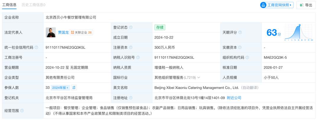【#贾国龙卸任西贝小牛法人代表# 任期不足2周】#西贝更名# 企查查APP显示,近日,北京西贝小牛餐饮管理有限公司发生工商变更,公司更名为北京贝牛餐饮管理有限公司,贾国龙卸任法定代表人、经理、董事职位,由何海宾接任。值得注意的是,1月27日,贾国龙刚刚接任该公司上述高管职务。目前,该公司由内蒙古西贝餐饮集团有限公司、内蒙古贾国龙功夫菜食品销售有限公司共同持股。(封面新闻)