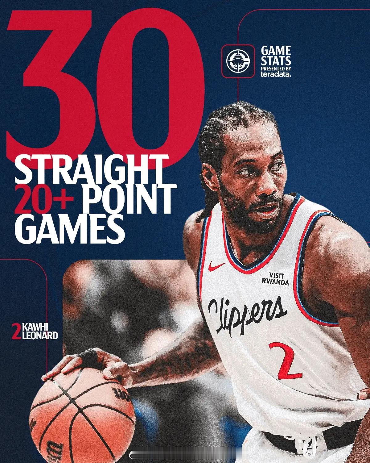 快船官方晒海报:伦纳德已经连续30场得分砍下20+!💥