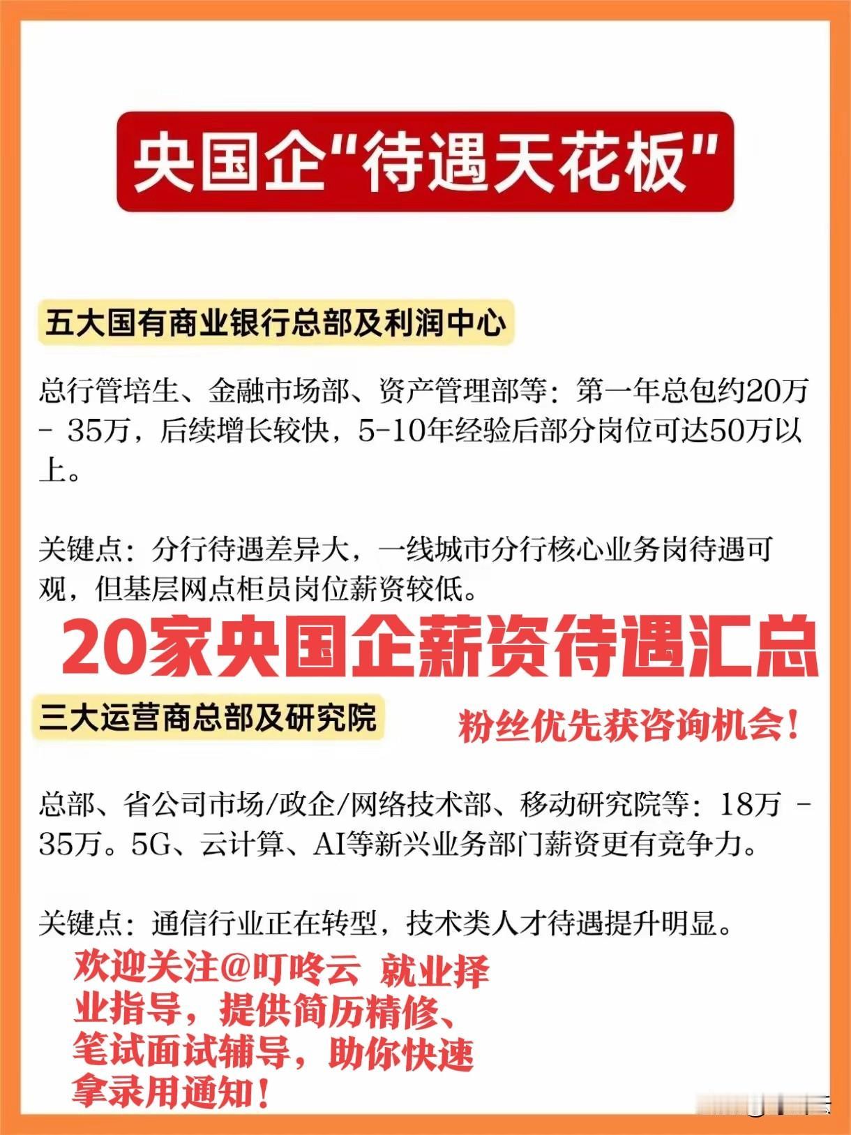 20家高薪国央企单位的薪酬和福利待遇汇总合集!这些都是最热门的、全网公认的待遇战力天花板!中国烟草、国家电网、三桶油、金融公司、高科技制造企业等等,赶紧点赞转发,速速收藏起来备用!我们只要上岸一家,福利待遇非常好,安安稳稳能干的退休!那么这些高薪到底有多高?薪酬福利待遇有哪些?对于求职择业来说,这些企业的职业发展前景有什么好处?速速围观揭秘详细内容![点亮平安灯][点亮平安灯][奋斗][奋斗] 本文汇总来自网络分享,具体岗位具体分析,仅供求职择业参考,勿上纲上线。如有不同见解,欢迎评论区补充和留言交流讨论相关话题。欢迎关注@叮咚云 将优先为粉丝职业规划指导,为你定制最适合的就业择业方案!欢迎留言交流讨论。[来看我][来看我] 免责声明:图片来自网络,仅供参考! 国企招聘 央国企招聘 央企招聘 央国企就业推荐