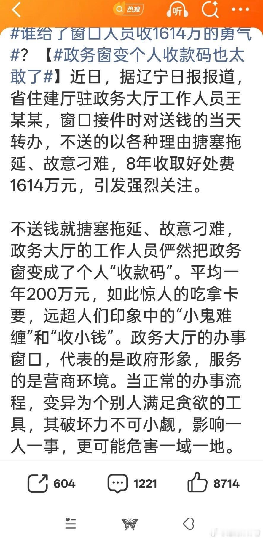 谁给了窗口人员收1614万的勇气现在都政务公开,都有网络渠道反馈,这人能这么干八